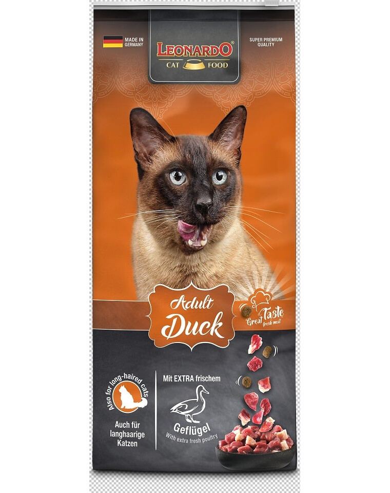 Leonardo® Adult Duck is een heerlijke smaakvariant voor katten die van gevogelte houden. Bovendien is de formule verfijnd met chiazaad en delicate krill - de schaaldieren uit de Antarctis. Hun hoge gehalte aan omega-3-vetzuren zorgt samen met lecithine voor een gezonde huid en een glanzende vacht.