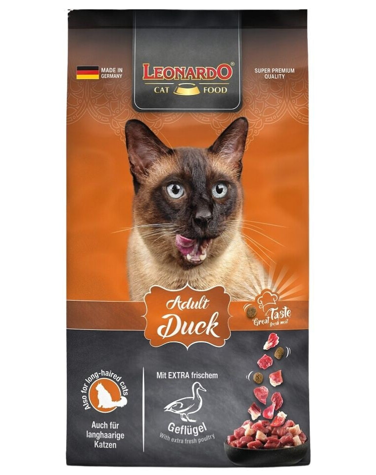 Leonardo® Adult Duck is een heerlijke smaakvariant voor katten die van gevogelte houden. Bovendien is de formule verfijnd met chiazaad en delicate krill - de schaaldieren uit de Antarctis. Hun hoge gehalte aan omega-3-vetzuren zorgt samen met lecithine voor een gezonde huid en een glanzende vacht.