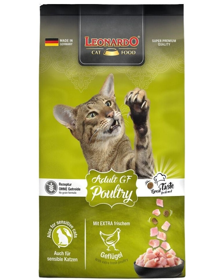 Bij de receptuur van LEONARDO® Adult Poultry GF is er afgezien van het gebruik van gluten of granen. Voedzaam amaranth vervangt in deze samenstelling de granen. Vooral bij katten met voedselintoleranties of katten die gevoelig zijn voor allergieën is LEONARDO® Adult Poultry GF de perfecte oplossing.