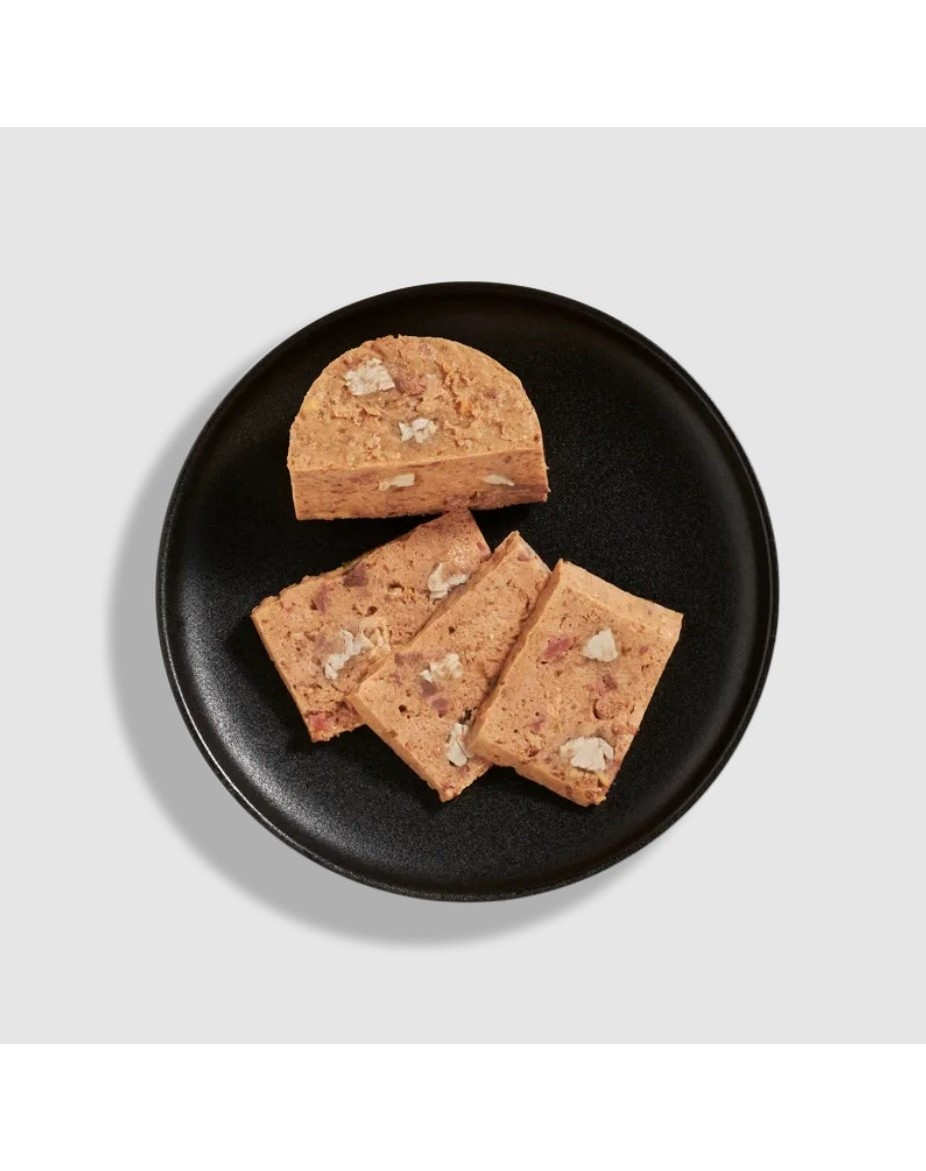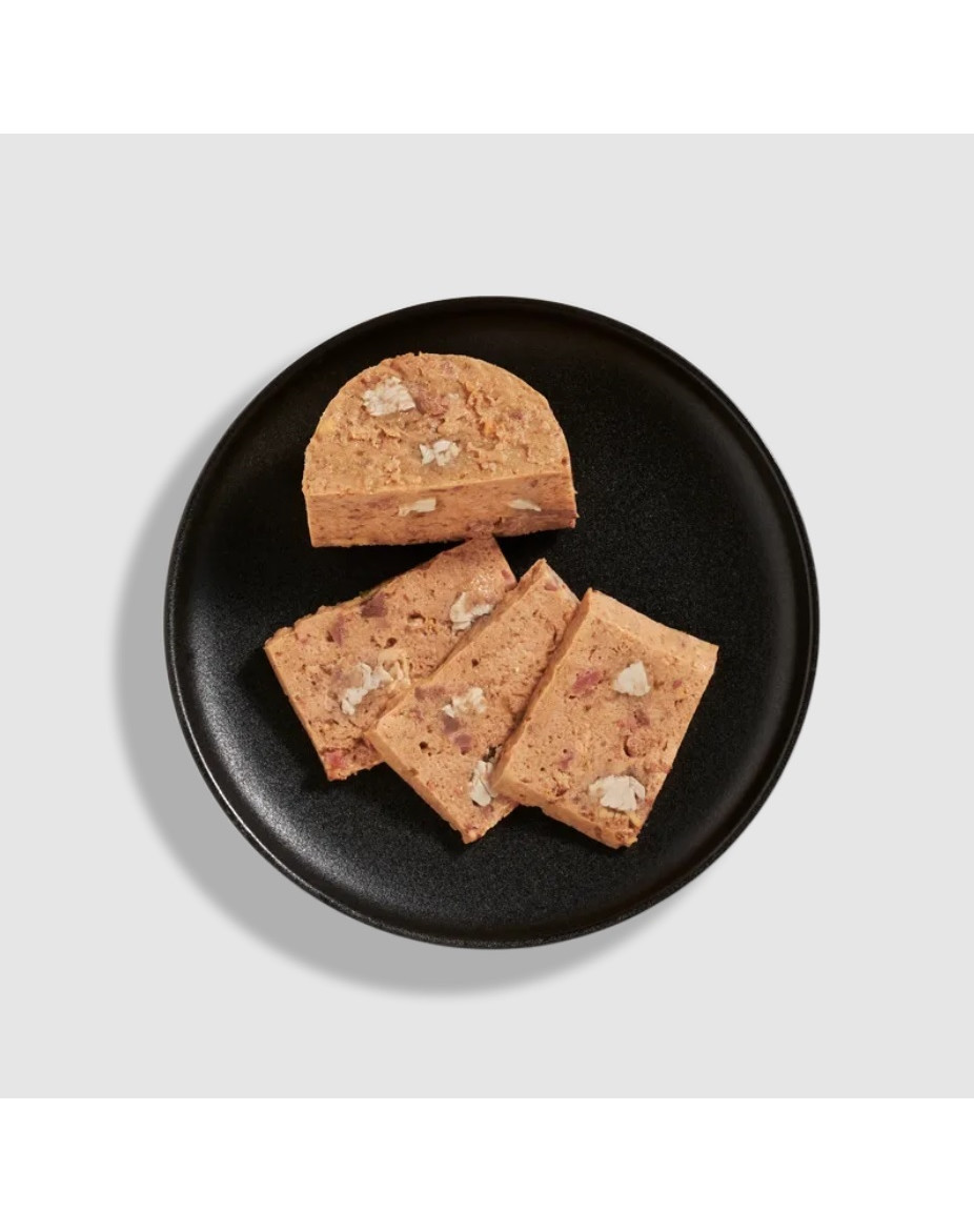 Zacht gegaard in zijn eigen sap, wordt het vlees een onweerstaanbare lekkernij. De zalmolie geeft het recept de laatste finishing touch en levert de vetzuren voor een bijzonder zijdezachte vacht. Natuurlijk vrij van suiker, kunstmatige kleurstoffen, aroma's en conserveermiddelen.