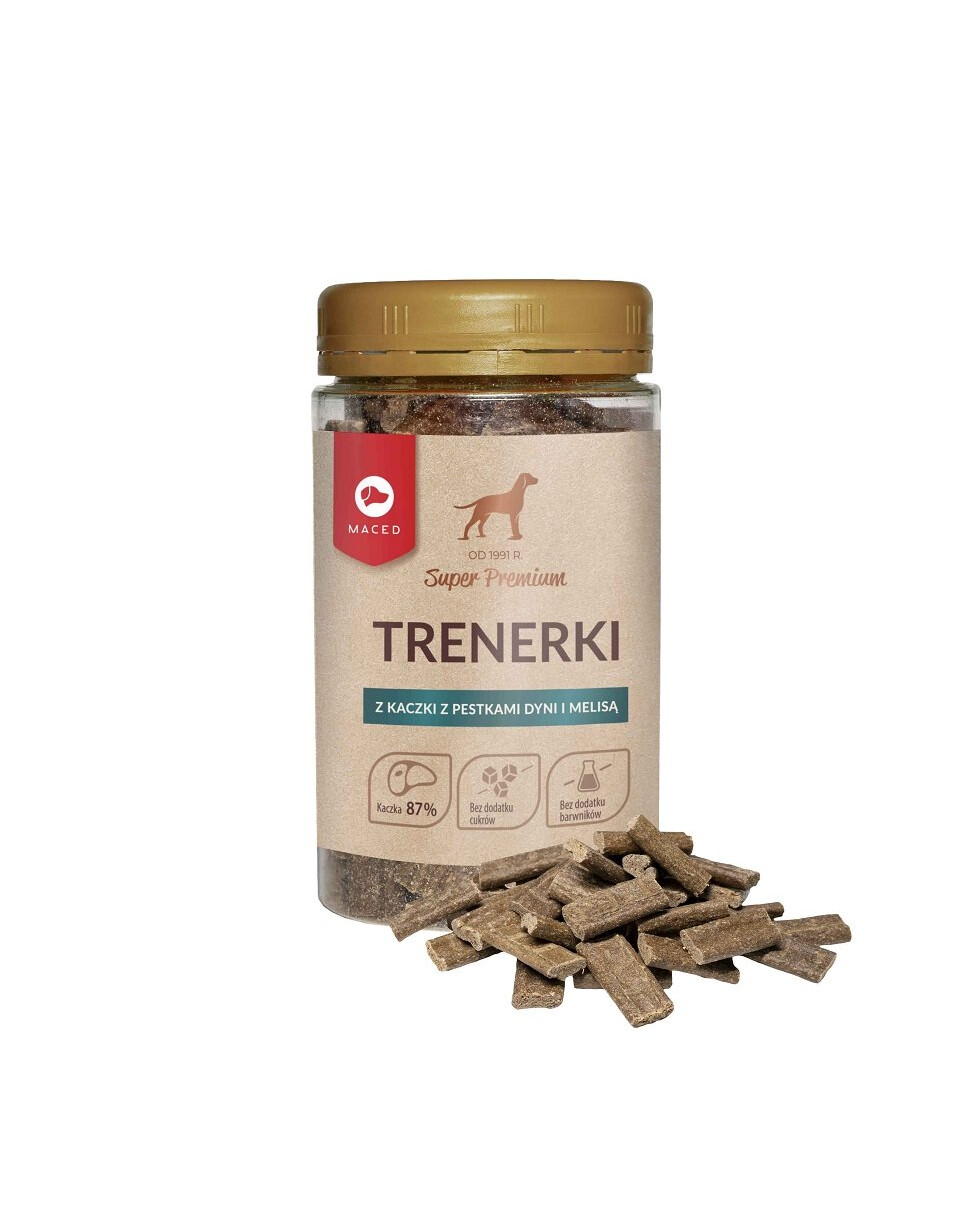 Eend trainers met pompoenpitten en citroenmelisse zijn een lekkere snack met tot 87% eend, die ideaal is als beloning tijdens de training. Eend is rijk aan fosfor, ijzer en calcium en de toevoeging van pompoenpitten ondersteunt de gezondheid en het immuunsysteem van uw hond. De trainers zijn dankzij hun zachtheid geschikt voor alle honden, en de vleessmaak en het uitnodigende aroma zorgen ervoor dat honden ze graag eten.