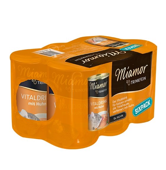 Vitaliteitsdrank met Kip. Motiveert tot meer vochtinname. Katten drinken vaak heel weinig, omdat ze hun vochtbehoefte liever via het voedsel dekken. Wanneer er geen voldoende vochtinname is, zijn katten kwetsbaarder voor de vorming van urinestenen (dit geldt vooral voor katten die uitsluitend droogvoer gebruiken). Miamor Drinkfine ondersteunt dit door zijn bijzondere smakelijkheid.