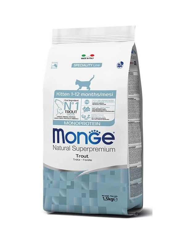 MONGE NATURAL SUPERPREMIUM KITTEN MONOPROTEIN TROUT is een volledig en uitgebalanceerd voer voor kittens. Formule voor het welzijn van uw kitten dankzij de evenwichtige hoeveelheid calcium en fosfor, die het groeiproces ondersteunt.