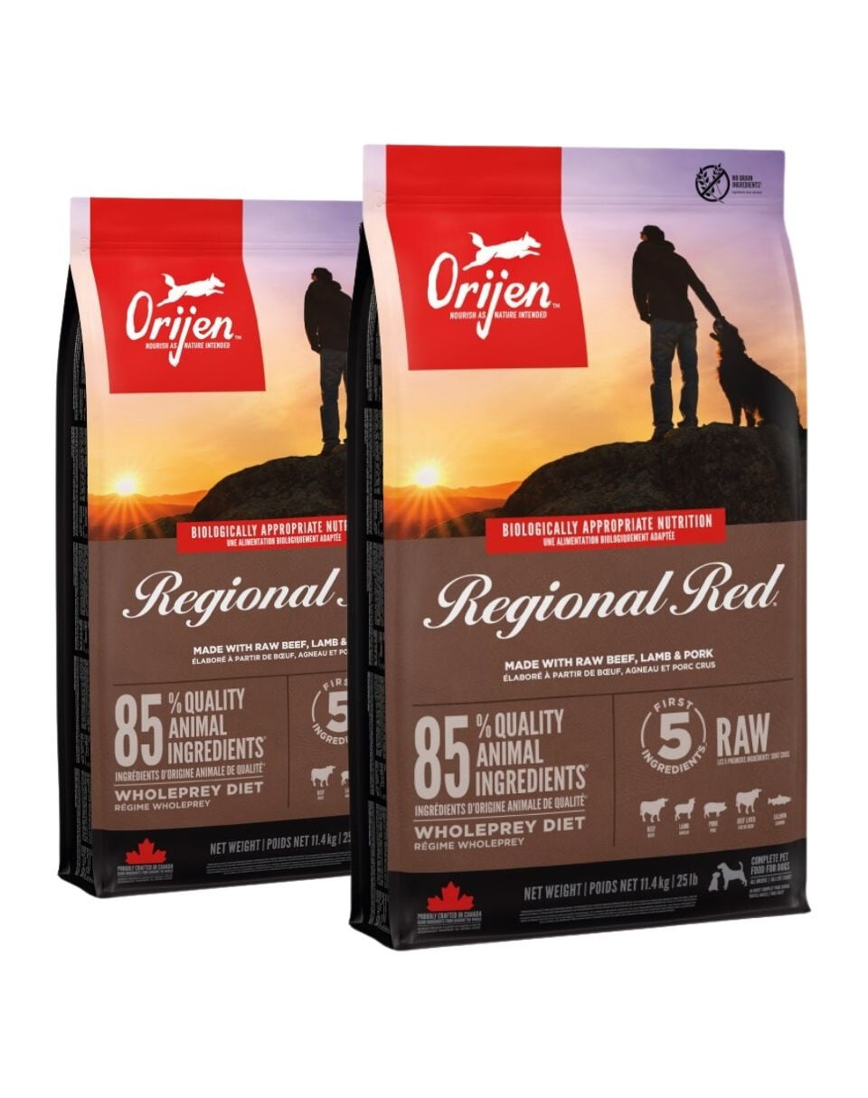 ORIJEN Regional Red bestaat uit 38% voedzaam eiwit en slechts 18% koolhydraten en voedt honden van alle rassen zoals het hun natuurlijke behoeften vereist.