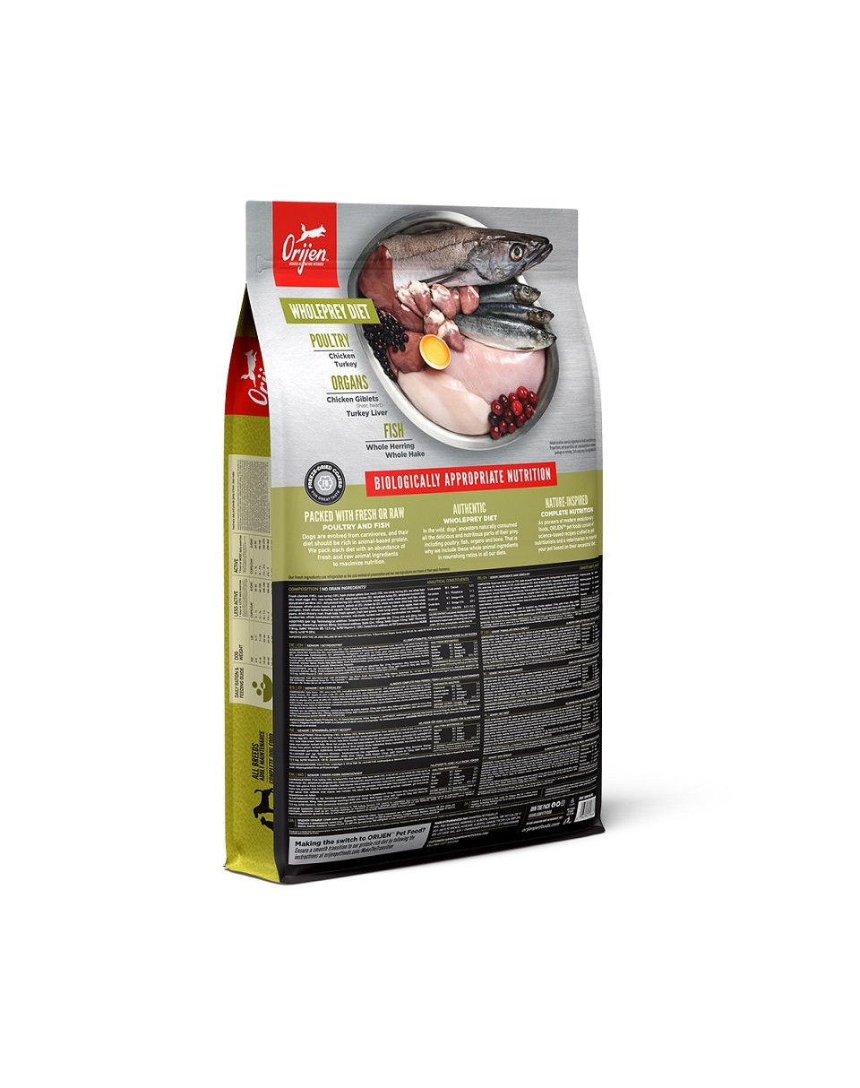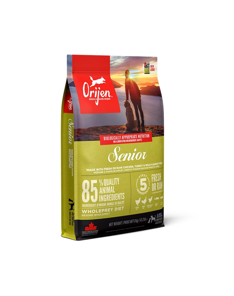 ORIJEN bestaat uit 42% voedzaam eiwit en slechts 17% koolhydraten en voedt oudere honden van alle rassen zoals het hun natuurlijke behoeften vereist.