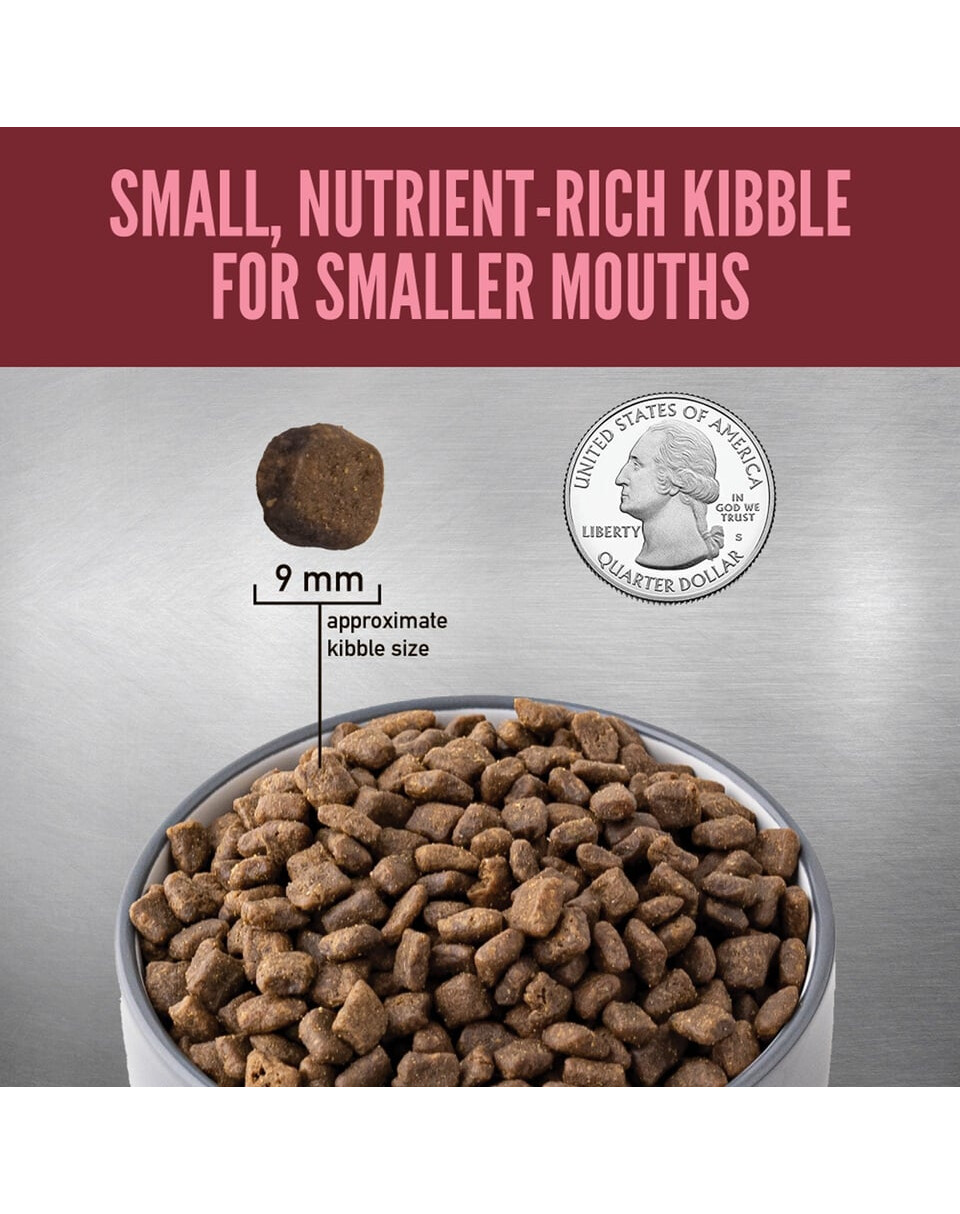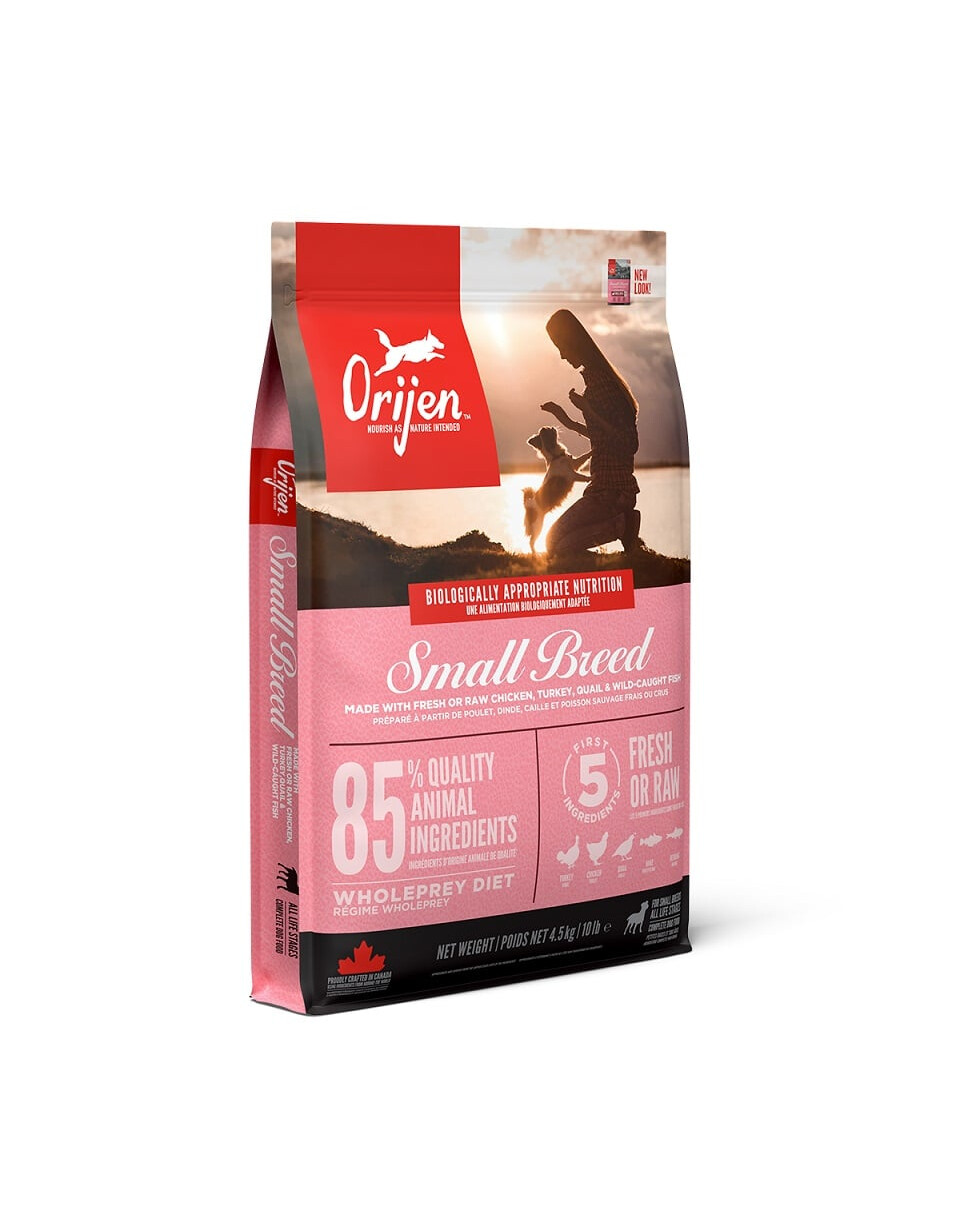 Kleine puppy's hebben ook een soortgelijke voeding nodig als wilde roofdieren: een voeding die rijk is aan verschillende vleessoorten en een verscheidenheid aan eiwit- en vetbronnen biedt. Op tafel liggen kalkoen, kip, kwartel, steenvis en haring, die allemaal zijn bedekt met Lutein-verrijkte eieren. In verhouding tot WholePrey mogen er geen ingewanden of kraakbeen uit het recept worden weggelaten. Daarom past de voedingssamenstelling van ORIJEN Small Breed bij de oude voeding, en is de grootte van de brok aangepast aan de behoeften van kleine dieren.
