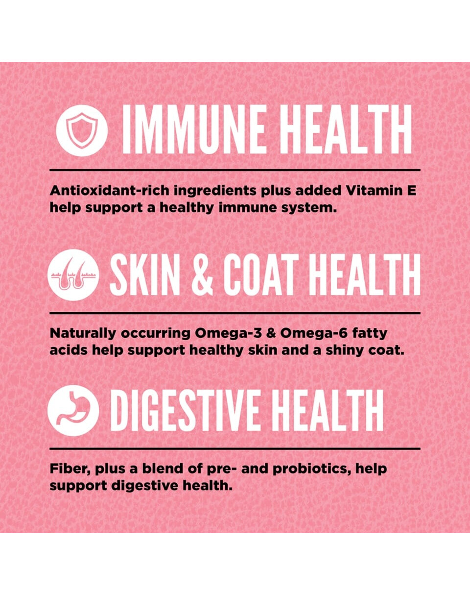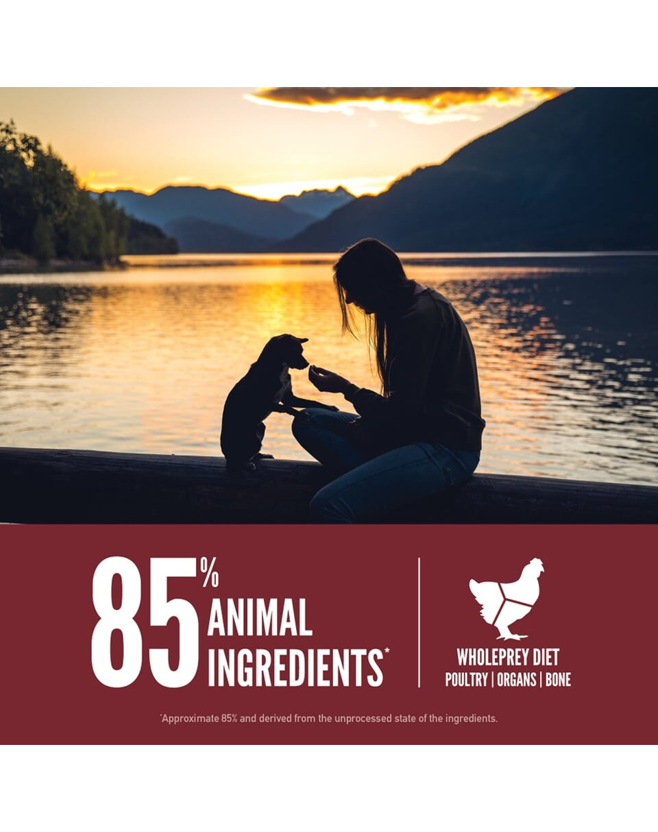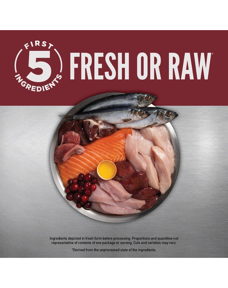 Vers kalkoenvlees (15%), vers kippenvlees (13%), rauw kwartelvlees (4%), verse diepgele eieren (4%), rauwe hele steenvis (4%), rauwe hele haring (4%), verse kalkoenlever (4%), verse kippenlever (4%), vers kippenhart (4%), vers kalkoenhart (4%), gedroogd kalkoenvlees (4%), gedroogd kippenvlees (4%), gedroogde haring (4%), gedroogde kippenlever (4%), gedroogde hele eieren (4%), hele rode linzen, hele bonen, hele groene linzen, kippenvet (3%), hele kikkererwten, linzen, hele erwten, kalkoenkraakbeen (0,5%), kippenkraakbeen (0,5%), gele kabeljauwolie (0,5%), freeze-dried kippenlever (0,5%), Nieuw-Zeelandse mosselen, verse algen, verse hele pompoen, zout, verse appels, verse wortelen, verse peren, verse courgette, cichoreiwortel, verse bietenbladeren, verse spinazie, verse hele bosbessen, verse hele veenbessen, lavendel, medicinale zilverwortel, mariadistel, rozenbottel.
