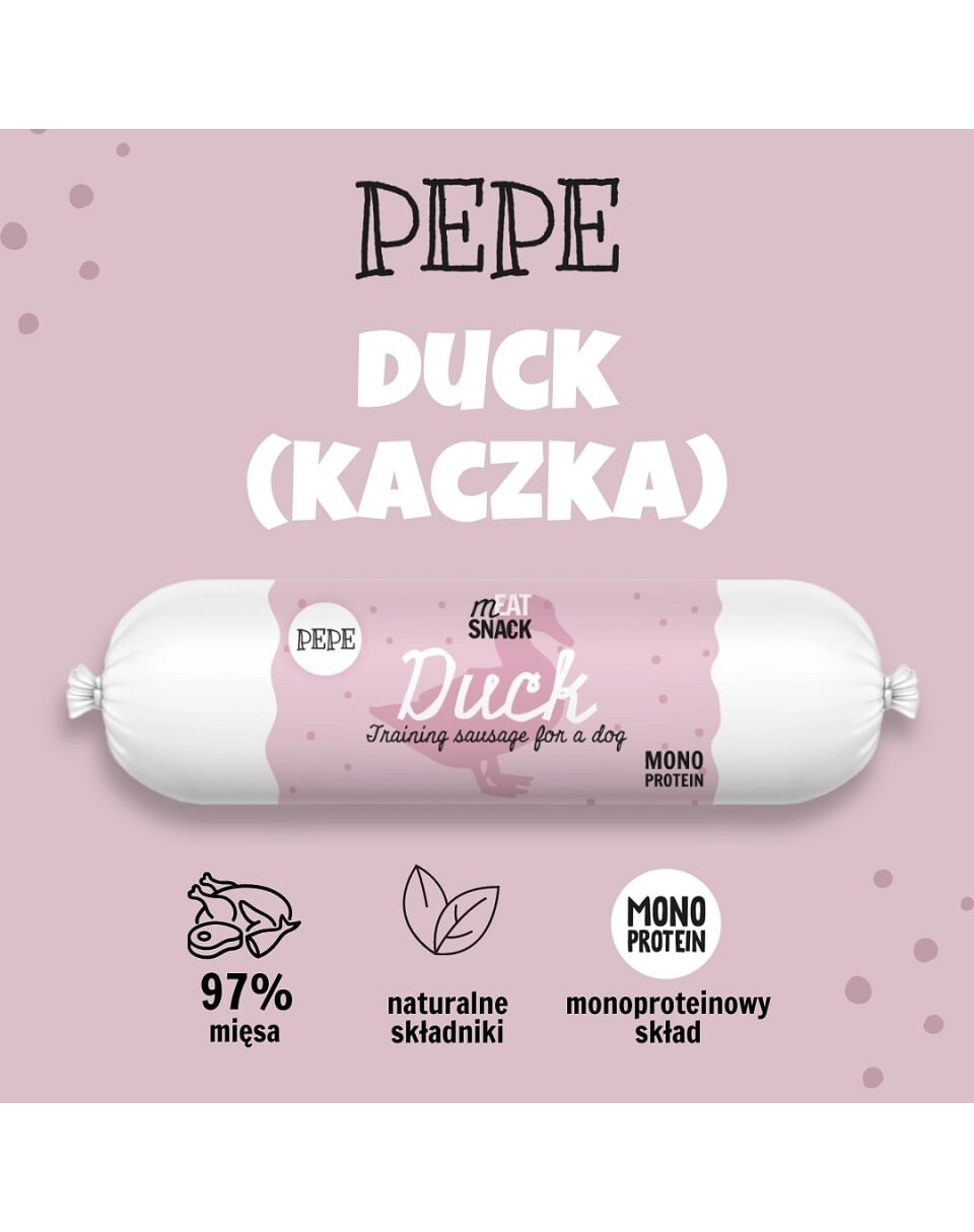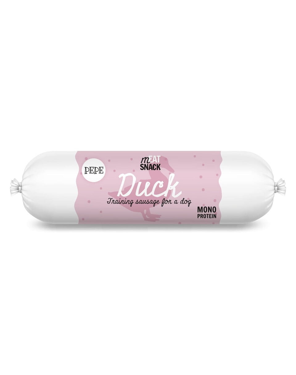 PEPE Meat Snack Duck Sausage is de perfecte aanvulling op de voeding van uw hond! Het bevat tot 97% eendenvlees en 3% glutenvrije, licht verteerbare tapioca.