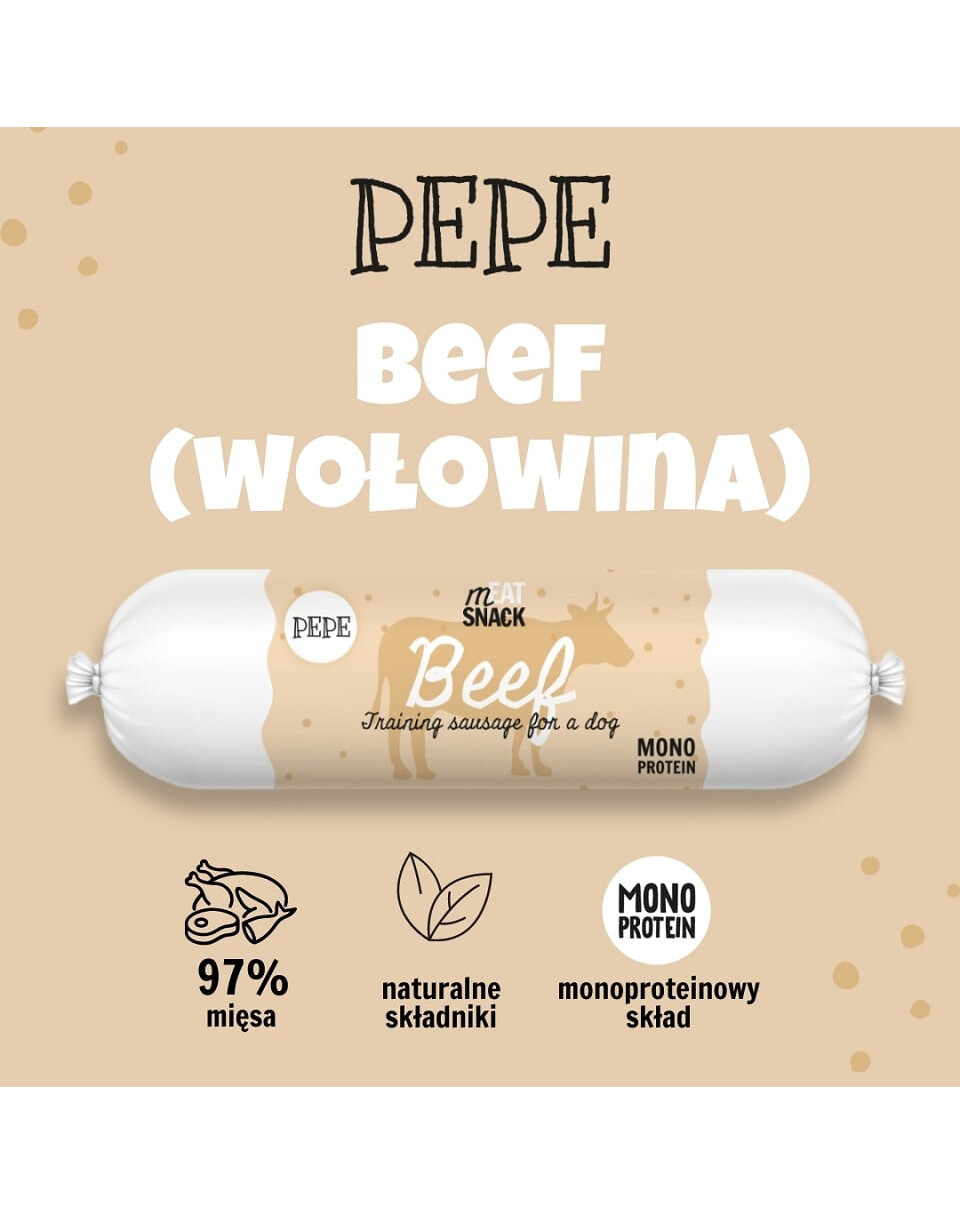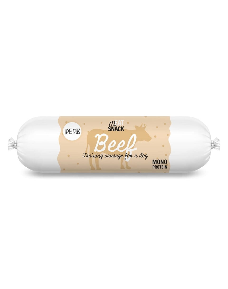 PEPE Meat Snack Beef Sausage is een ideale aanvulling op de voeding van uw hond of kan als beloning tijdens de training worden gegeven.