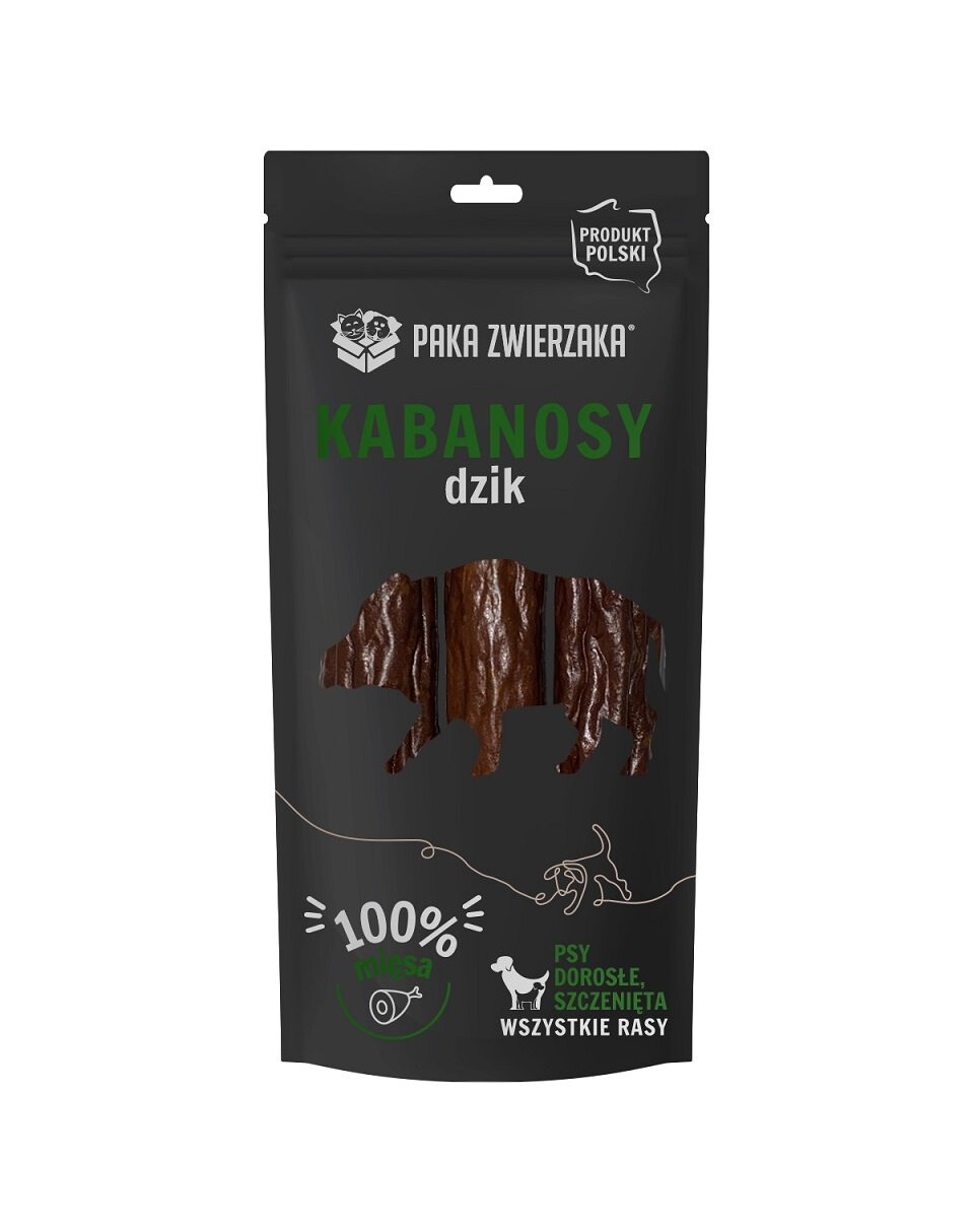 Knapperige, smakelijke Kabanos van wildzwijnvlees. Een uitstekende, 100% natuurlijke aanvulling op de voeding van honden van alle groottes. De toevoeging van collageen ondersteunt de soepele werking van het circulatie- en spijsverteringssysteem. De warme lucht droging geeft ze een uitzonderlijke knapperigheid en behoudt alle waardevolle vitamines en mineralen. Bij het kauwen masseert het het tandvlees, verwijdert het tandsteen en bevredigt het kauwbehoefte. Het product bevat geen conserveermiddelen, smaakversterkers, aroma's of vulstoffen.