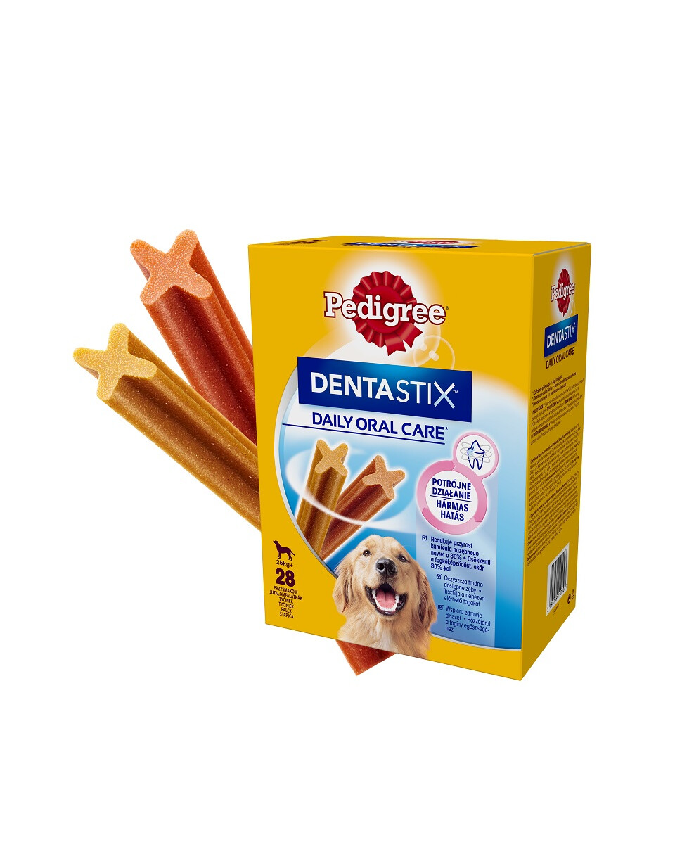 PEDIGREE DentaStix Daily Care is een aanvullend diervoeder voor honden vanaf 4 maanden. Deze traktatiegrootte is alleen bedoeld voor honden met een gewicht boven de 25 kg. PEDIGREE Dentastix heeft een positieve invloed op de tanden en het tandvlees van uw hond - het reinigt ze en vermindert de tandsteenvorming. Met PEDIGREE DentaStix zorgt u effectief voor de gezondheid en vitaliteit van uw hond.