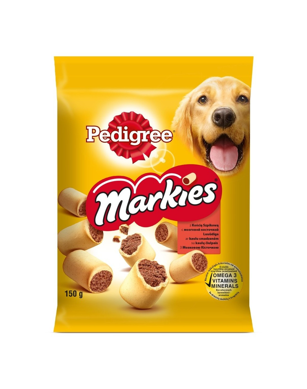 Het doet u plezier om te zien hoe hij vrolijk met zijn staart kwispelt en u uitnodigt om te spelen. U speelt graag met hem en het doet u plezier als hij naar u luistert. Soms wilt u hem belonen voor iets dat u verraste of amuseerde. Pedigree Markies zijn gewoon een zo'n lekkere beloning. Het zijn heerlijke koekjes, gevuld met vers geurend vlees met een hoog percentage beenmerg, wat de grootste delicatesse voor uw huisdier is. Dankzij hun optimale samenstelling bevredigen Pedigree Markies niet alleen de smaakzin van uw hond, maar vullen ze ook de voeding aan met fosfor en calcium, die essentieel zijn voor de juiste werking van het hondenlichaam.