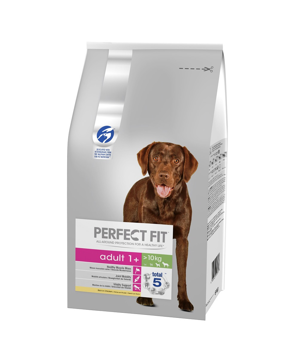Bij de voeding van uw hond is het belangrijk om in zijn dagelijkse behoefte te voorzien. Met een portie Perfect Fit™ Rich in Chicken hondenbrokken wordt de gezondheid, activiteit en geestelijke ontwikkeling van uw volwassen huisdier duurzaam ondersteund. De op de behoeften van middelgrote en grote rassen afgestemde formule van dit hondenvoer is ontwikkeld door dierenartsen en voedingsdeskundigen van het WALTHAM™ Animal Science Institute. Zij onderzochten de meest voorkomende gezondheidsproblemen bij honden. Dit maakte de ontwikkeling mogelijk van het innovatieve Perfect Fit™ Rich Chicken voer met de Total5-formule, die de 5 belangrijkste gebieden van de gezondheid van uw huisdier ondersteunt: een sterk immuunsysteem, mondverzorging, gezonde spijsvertering, gezonde huid en vacht, en het behoud van een optimale conditie en gewicht.