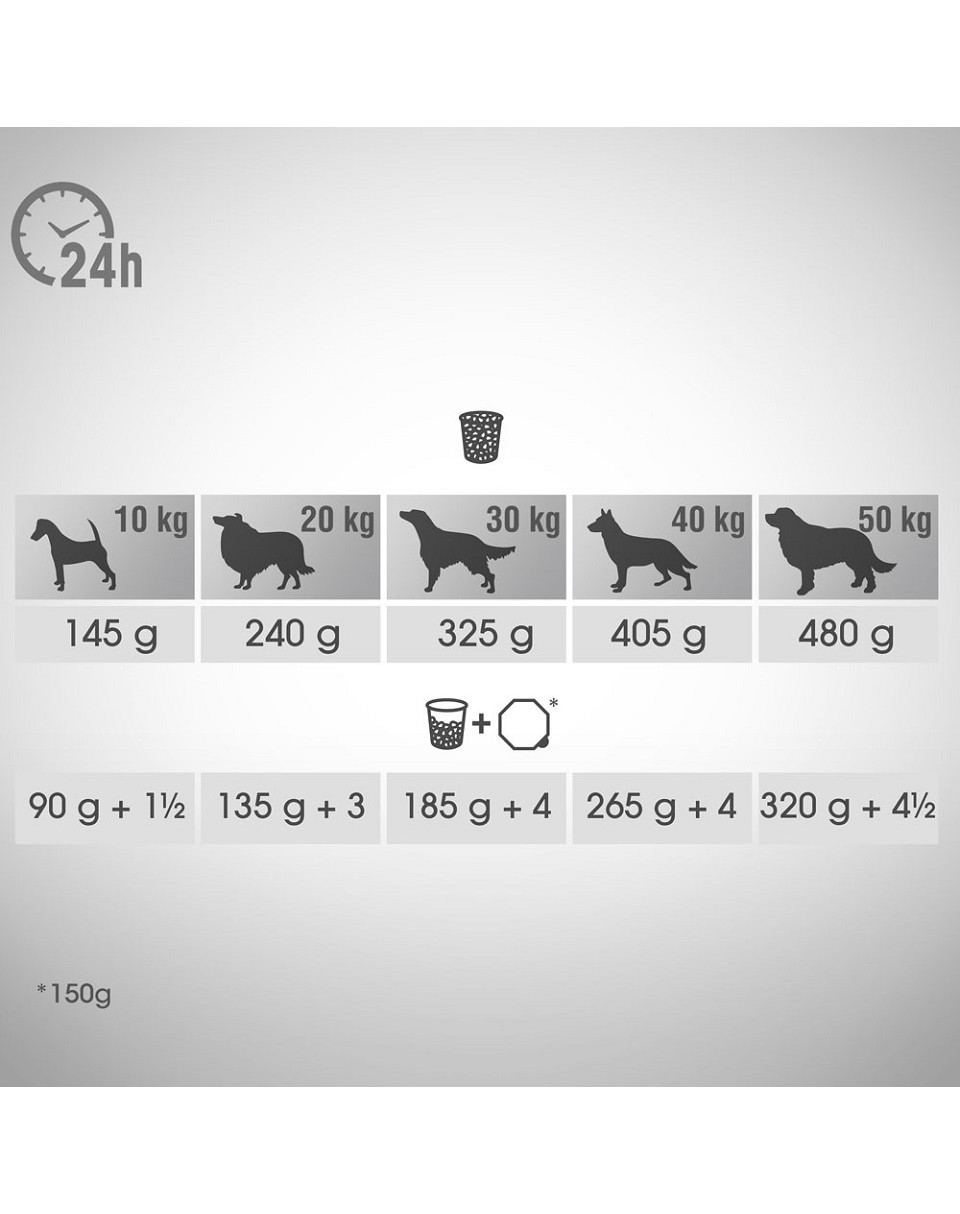 Bij overgewichtige honden dient u de dagelijkse hoeveelheid voer te verminderen. Houd rekening met de overgangsperiode en pas de hoeveelheid voer voor uw hond aan door deze op te splitsen in maaltijden die aan de behoeften van uw huisdier voldoen. Zorg ervoor dat uw hond altijd vers drinkwater heeft.