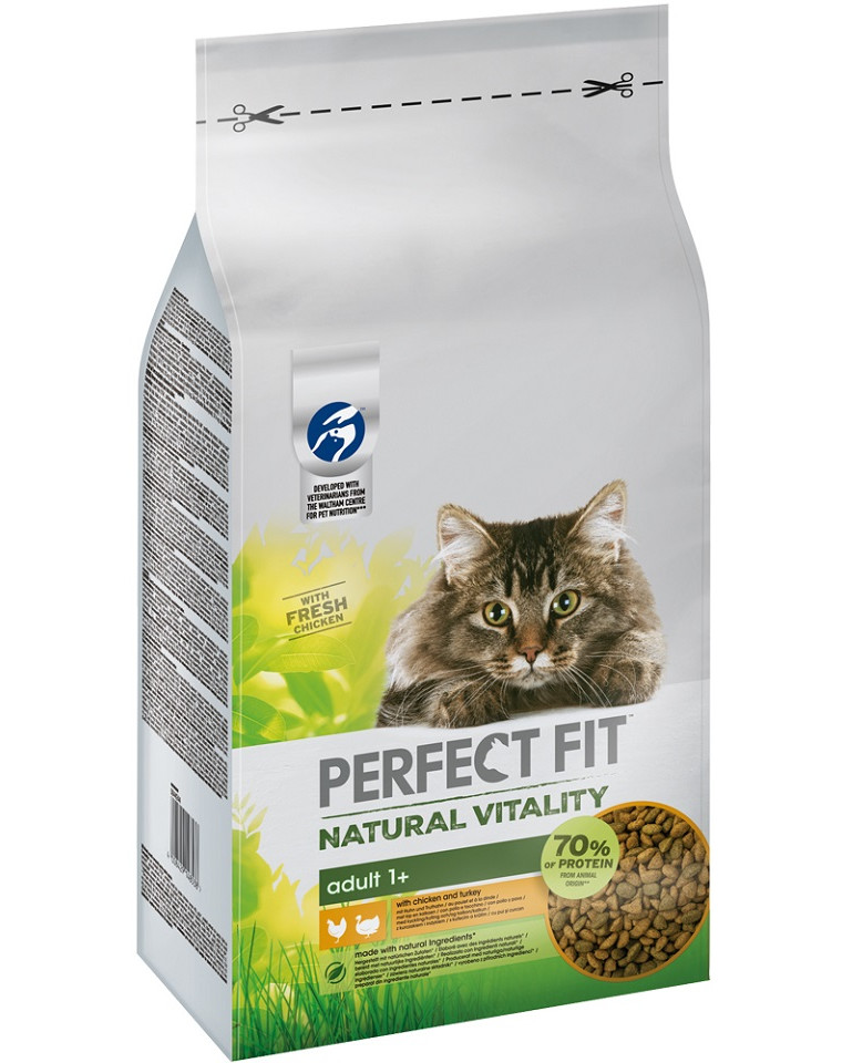 Wat voert u uw kat elke dag? Kies voor PERFECT FIT™ Natural Vitality kattenvoer met Kip en Kalkoen. Het onderscheidt zich door zijn unieke formule, ontwikkeld door dierenartsen en voedingsdeskundigen van het WALTHAM™ Animal Science Institute. PERFECT FIT™ Natural Vitality kattenvoer met Kip en Kalkoen heeft een hoog gehalte aan dierlijke eiwitten en is daarmee afgestemd op de voedingsbehoeften van onverschrokken vleeseters zoals de kat. Het draagt bij aan de spieropbouw en levert de aminozuren die nodig zijn voor een gezond leven. PERFECT FIT™ Natural Vitality met Kip en Kalkoen voldoet aan de voedingsbehoeften van de kat, die in haar natuur liggen.