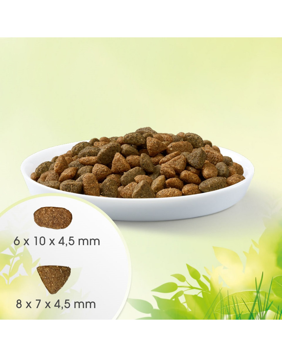Samenstelling: vers kippenvlees (17%)*, gedroogd gevogelte-eiwit (incl. kalkoen 4%), tarwe*, krabproteïne, maïsmeel*, sojaproteïne, oliën en vetten (incl. zonnebloemolie 0,4%), sojameel, bietenpulp*, gedroogd graaneiwit, leverhydrolysaat, cellulose*, mineralen, gist (1%)*, gedroogde appelstukjes*.