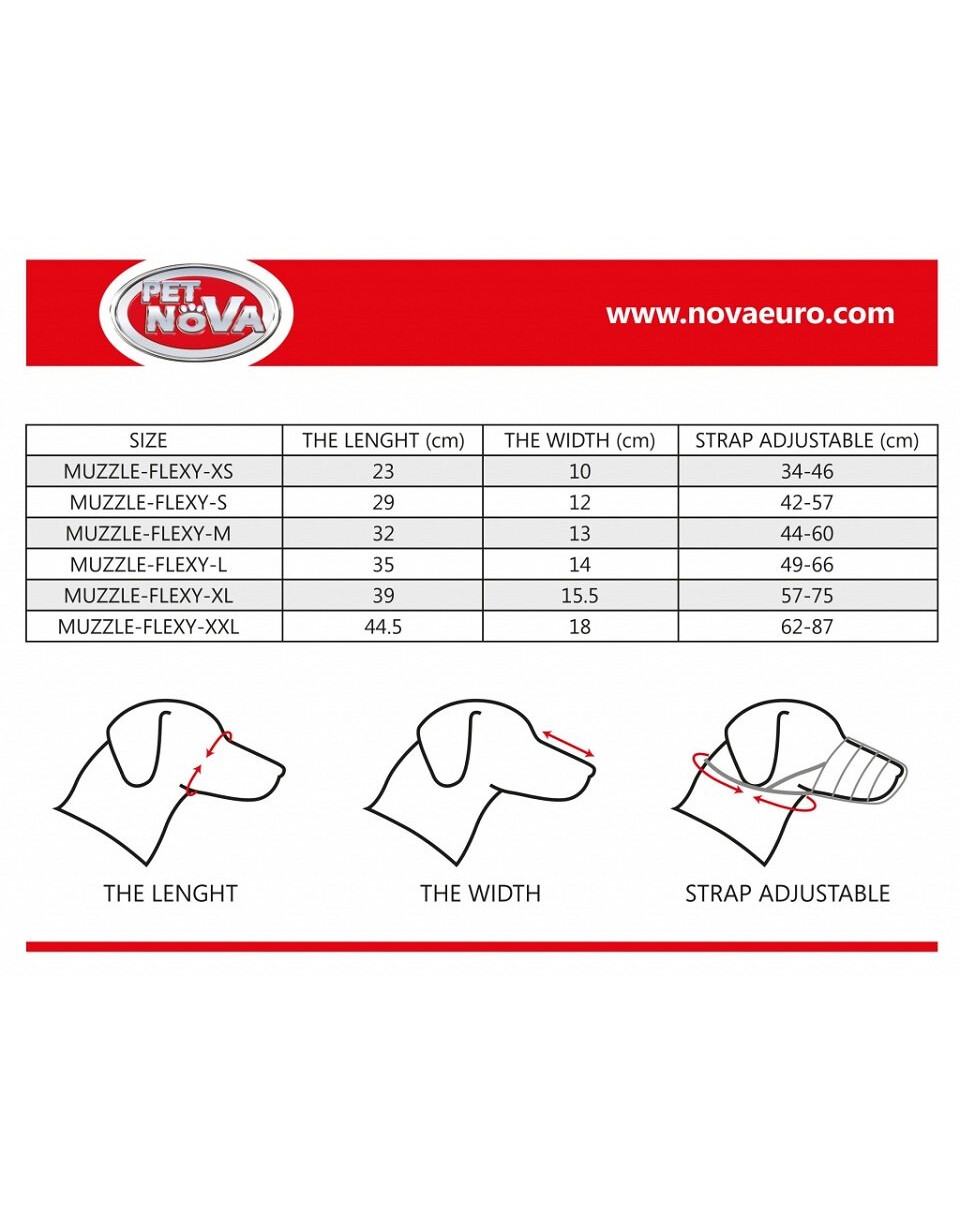 De PET NOVA Flexy muilkorf is gemaakt van een zeer robuust materiaal, waarbij het product zeer flexibel is. De muilkorf garandeert daarmee maximale veiligheid en comfort, aangezien de hond vrij kan drinken en hijgen. Het intuïtieve verstel- en bevestigingssysteem van de muilkorf maakt het eenvoudig om deze in het dagelijks leven aan en uit te doen. De muilkorven zijn verkrijgbaar in zes maten. Zie afbeelding voor de maattabel. Het is belangrijk om de maat van de muilkorf zo te kiezen dat er ongeveer 1 cm ruimte is tussen de neus van de hond en het einde van de muilkorf.