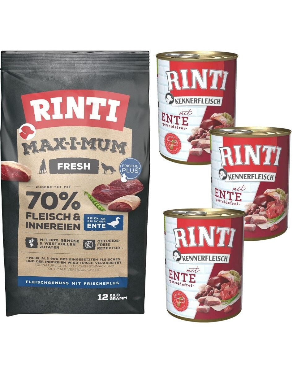 Rinti Max-i-Mum wordt bereid met 65% vers vlees en verse ingewanden. Dit komt overeen met meer dan 90% van de gebruikte vleesmaterialen. Hierdoor wordt de natuurlijke vleessmaak bevorderd en de voedselverwerking ondersteund. Met een verhoogd vetgehalte is een uitgebalanceerde eiwit-/vetverhouding voor een milde spijsvertering gewaarborgd. Graanvrij droogvoer wordt vaak met granen geproduceerd. De hond is van nature een vleeseter. Daarom gebruikt Rinti Maximum hoge versvleesgehaltes, die in een uitgebreid productieproces worden verwerkt.