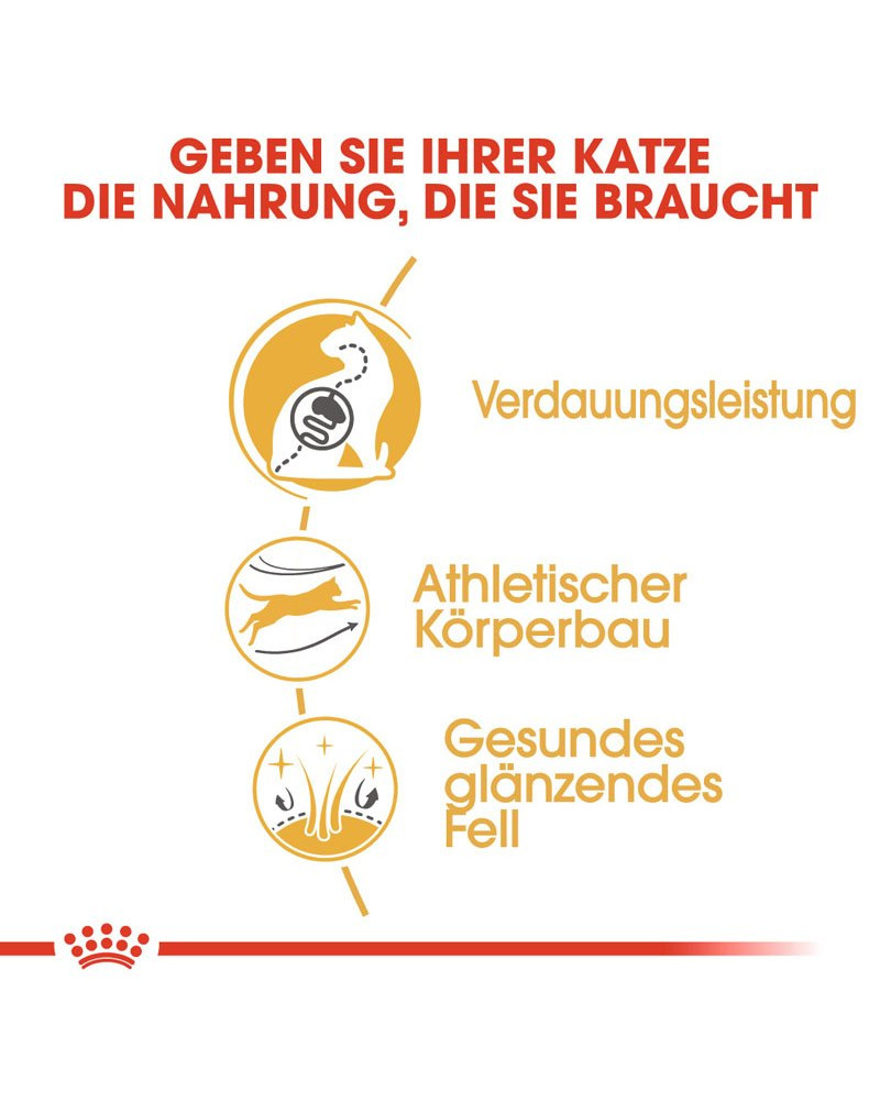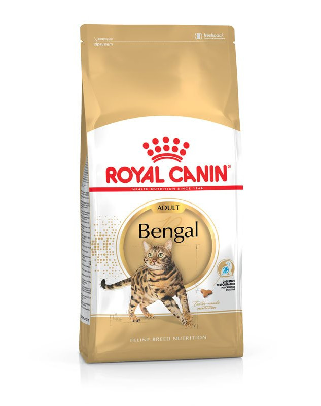 ROYAL CANIN Bengal Adult is speciaal afgestemd op de voedingsbehoeften van Bengal katten. Door een hoog eiwit- en aangepast vetgehalte draagt dit voer aanzienlijk bij aan het behoud van de spiermassa van Bengal katten, om zo hun actieve levensstijl te ondersteunen.
