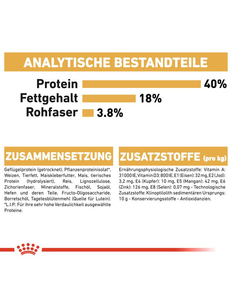 ANALYTISCHE BESTANDDELEN: Eiwit: 40% - Vetgehalte: 18% - Ruw as: 7,7% - Ruwe vezel: 3,8% - Per kg: Omega 6-vetzuren: 43,1 g - Omega 3-vetzuren: 10,1 g.