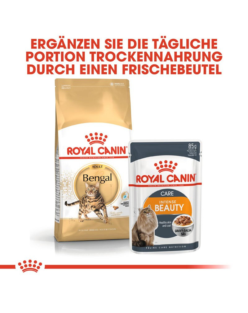 ROYAL CANIN Bengal Adult ist speziell auf die Ernährungsbedürfnisse von Bengal Katzen abgestimmt. Durch einen hohen Protein- und einen angepassten Fettgehalt trägt dieses Futter maßgeblich dazu bei, die Muskelmasse von Bengal Katzen zu erhalten, um so ihren aktiven Lebensstil zu unterstützen.