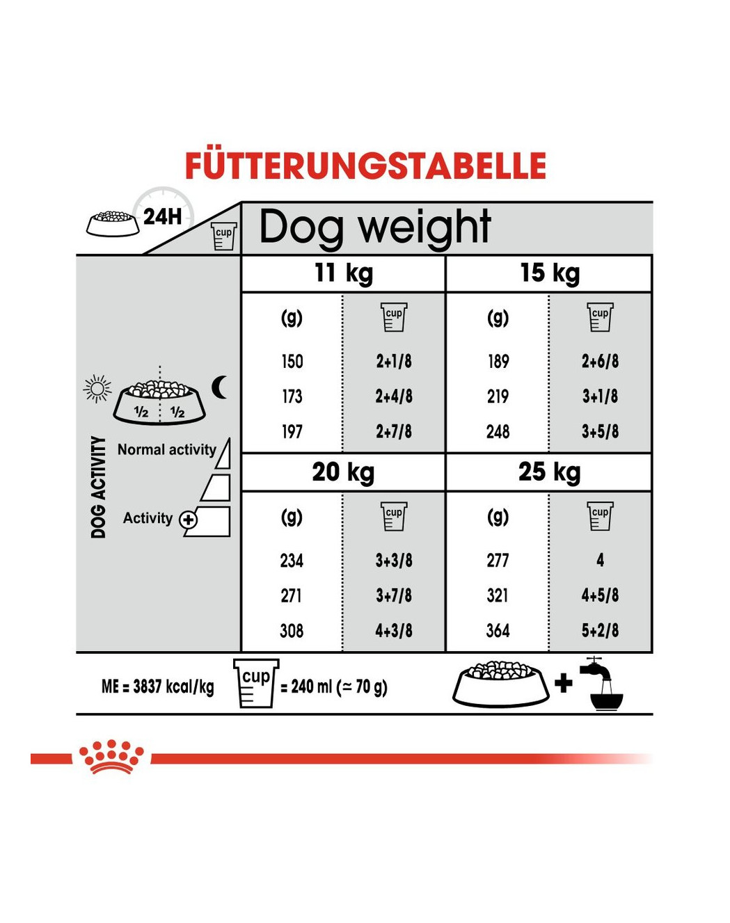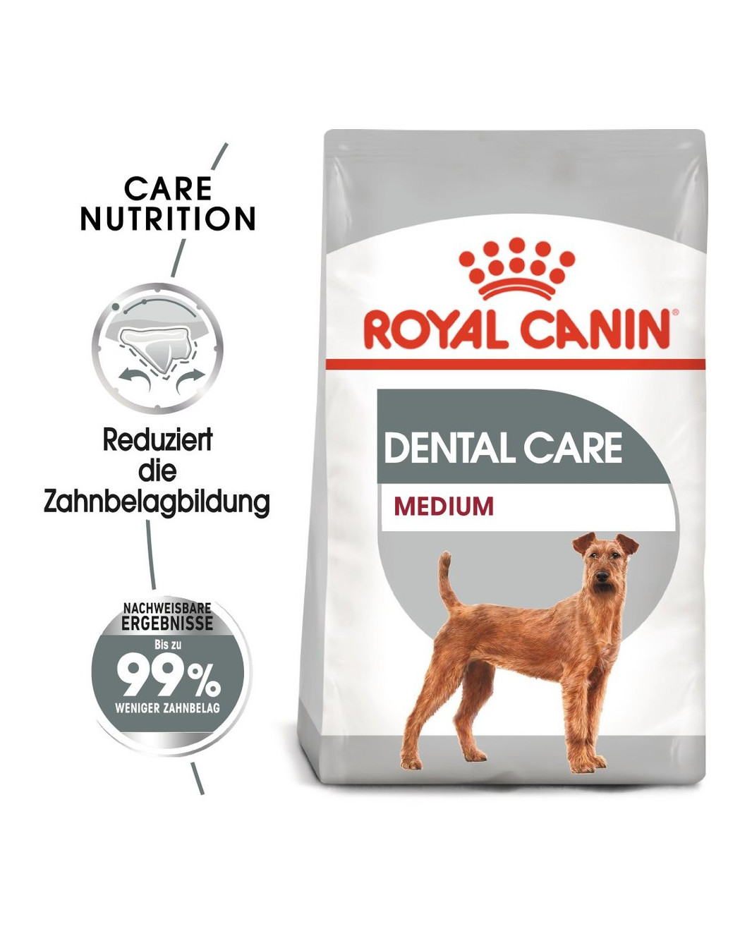 ROYAL CANIN Dental Care Medium eignet sich für Hunde mit einem Gewicht zwischen 11 und 25 kg und ist ein schmackhaftes Alleinfutter, das auch zum Schutz der Zähne Ihres Hundes beitragen kann.