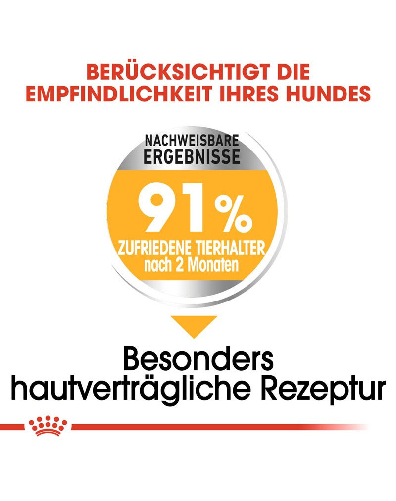 Een geïrriteerde huid is echt vervelend, ook voor uw hond. Wist u dat huidproblemen bij honden een van de meest voorkomende redenen voor een dierenartsbezoek zijn? Een gevoelige, jeukende huid zorgt ervoor dat uw hond vaak krabt. Daarbij kan hij met zijn klauwen zijn huid verwonden, wat het risico op een infectie verhoogt. Bij de huidvriendelijke formule van ROYAL CANIN Dermacomfort Mini is zorgvuldig gelet op het gebruik van speciaal geselecteerde eiwitten. Deze speciaal aangepaste voeding helpt om de huid van een hond in de best mogelijke staat te houden. Bovendien helpt het om de vacht van uw hond sterk en gezond te houden.