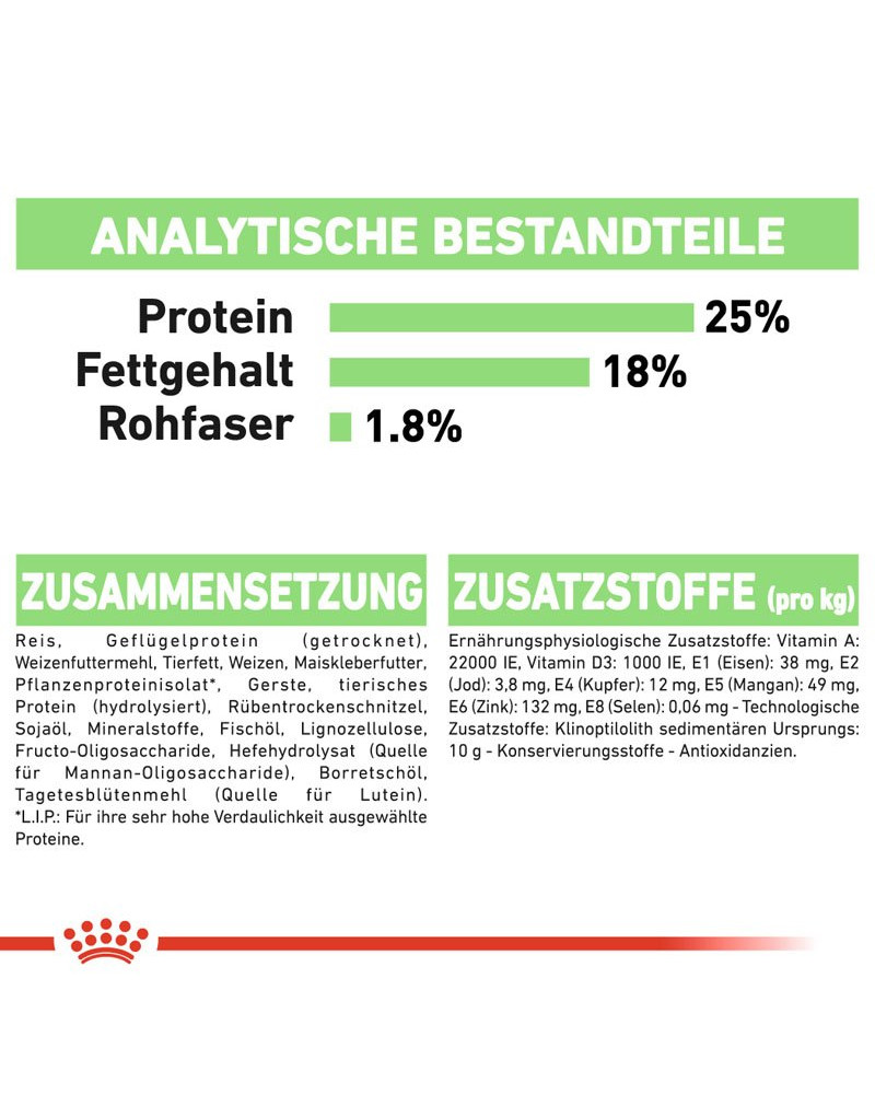 Deswegen verwenden wir bei Royal Canin ausschließlich die hochwertigsten Proteine und passen die Proteinquellen an die exakten Bedürfnisse Ihres Hundes an. Diese gute Verdaulichkeit wird regelmäßig durch umfassende Qualitätsprüfungen sichergestellt.