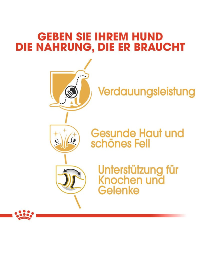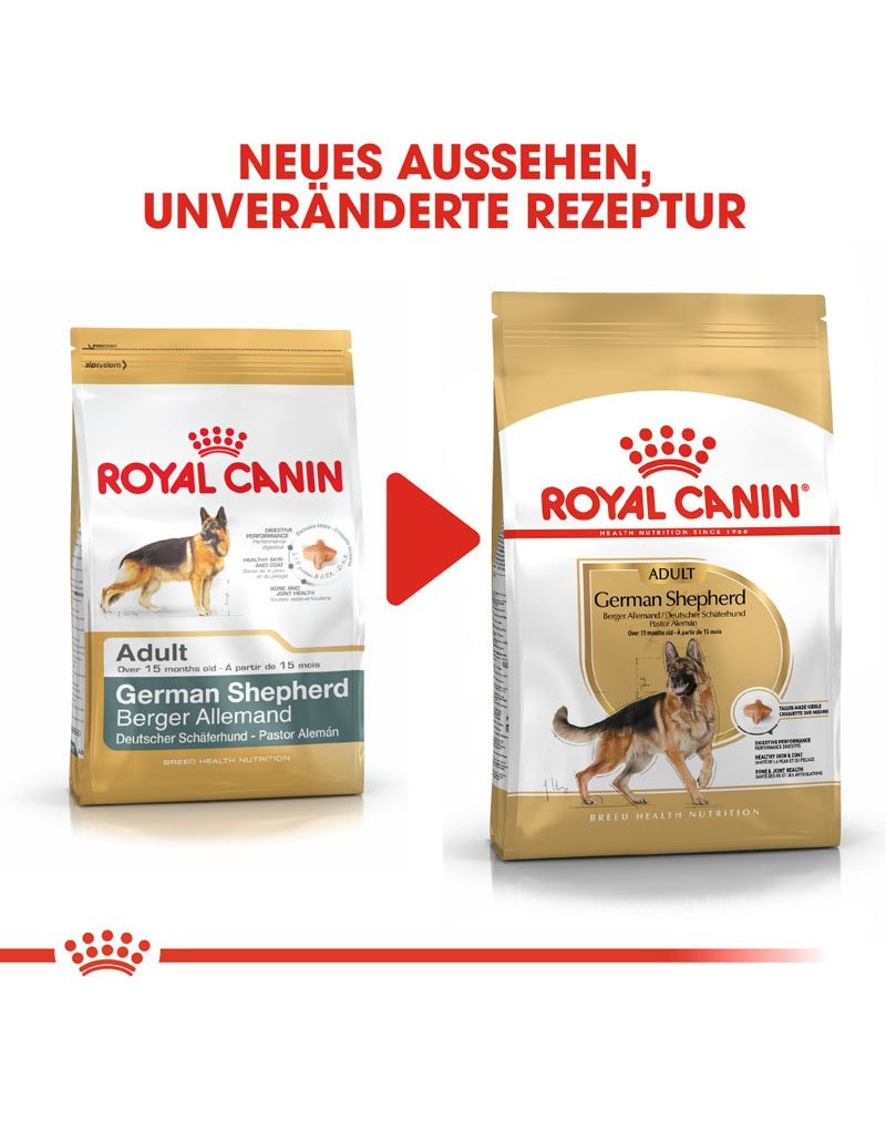 ROYAL CANIN German Shepherd ist für Deutsche Schäferhunde ab dem 15. Monat geeignet und wurde abgestimmt auf die Bedürfnisse dieser Hunderasse entwickelt. Die Trockennahrung trägt durch hochverdauliche L.I.P.-Proteine und eine Auswahl spezieller Fasern zur Unterstützung einer gesunden Verdauung bei. German Shepherd Adult unterstützt außerdem die Barrierefunktion der Haut dank eines speziellen Nährstoffkomplexes und den Omega-3-Fettsäuren EPA und DHA. Diese Fettsäuren tragen zu Pflege und Unterstützung der Haut- und Fellgesundheit Ihres Hundes bei.