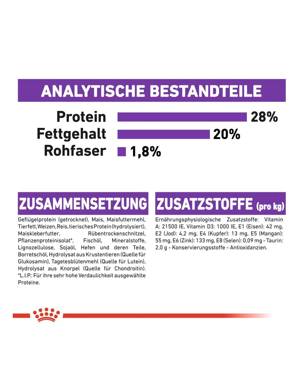 SAMENSTELLING: Gedroogd gevogelte-eiwit, tarwemeel, dierlijk vet, maïsmeel, maïs, plantaardige vezels, gehydrolyseerde dierlijke eiwitten, maïsgluten, bietenpulp, tarwegluten, mineralen, sojaolie, gistproducten, visolie, algenolie Schizochytrium sp., glucosamine uit fermentatie, tagetesmeel, gehydrolyseerd kraakbeen (bron van chondroïtine)