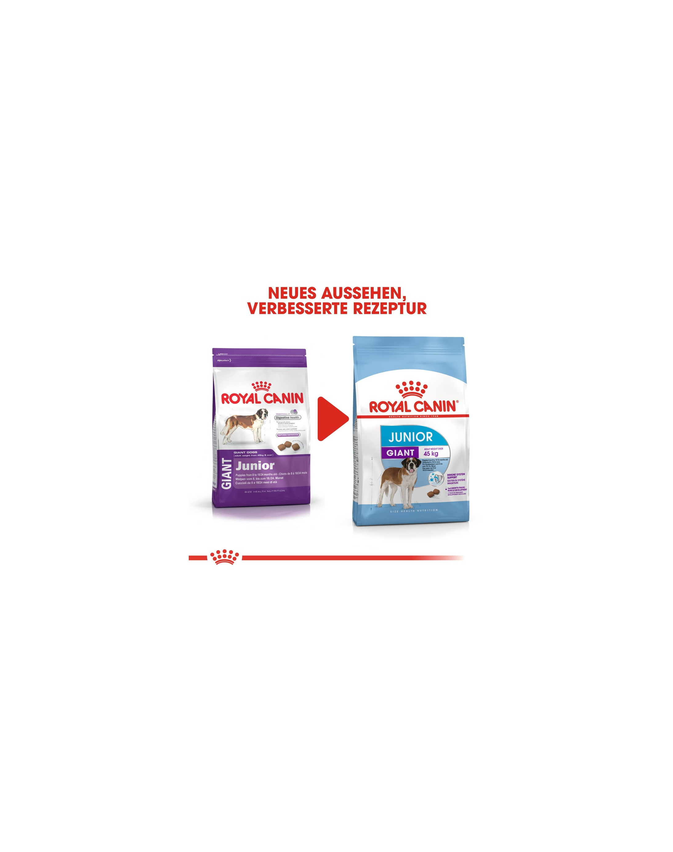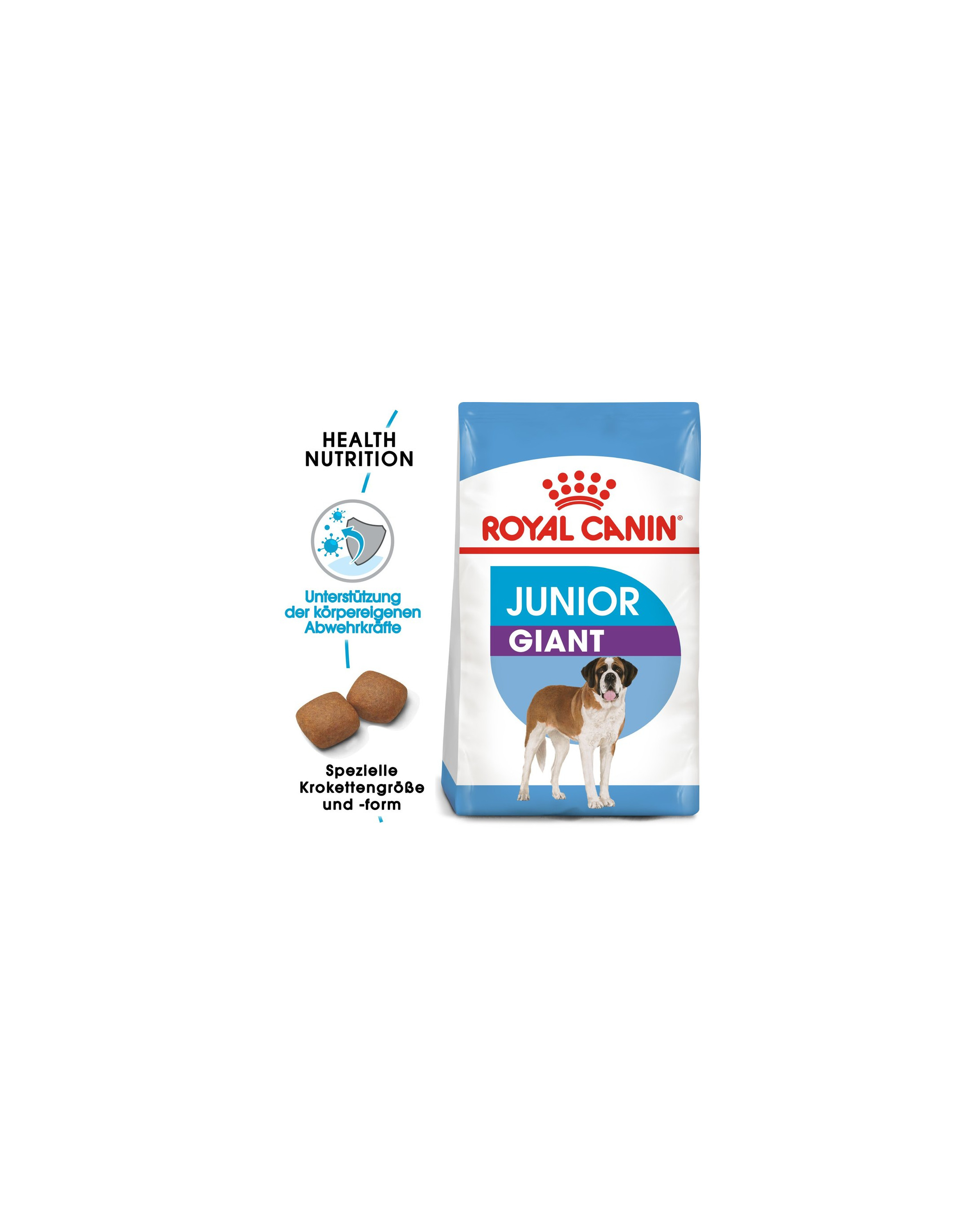 Het voer is geschikt voor puppy's van reuzenrassen van 8 tot 18/24 maanden oud, die in volwassen leeftijd een gewicht van 45 kg of meer bereiken. Aangezien het immuunsysteem van puppy's nog niet volledig ontwikkeld is, bevat ROYAL CANIN Giant Junior een gepatenteerd complex van antioxidanten (inclusief het belangrijke vitamine E), dat bijdraagt aan de opbouw van hun natuurlijke afweer.
