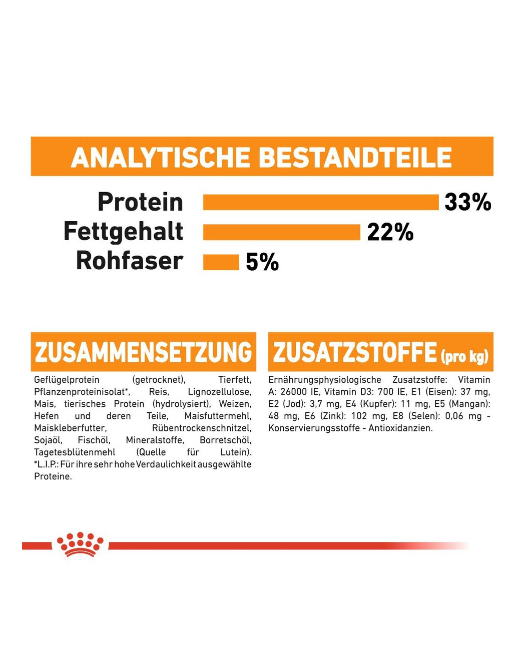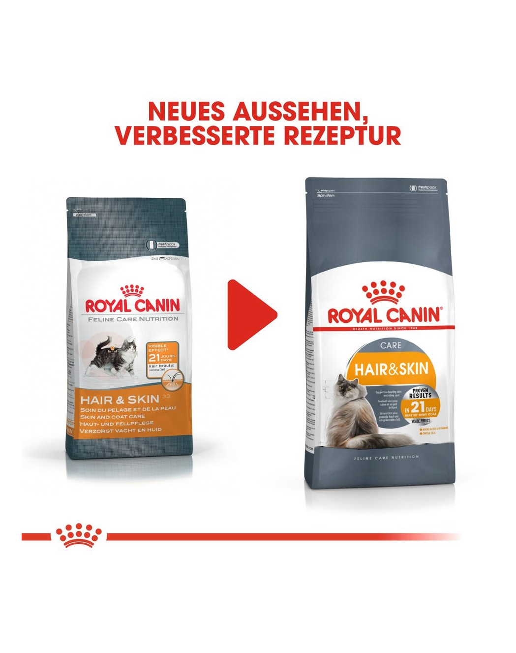 ROYAL CANIN Hair & Skin Care bevat bovendien een combinatie van omega-3- en omega-6-vetzuren, die het behoud van de huid- en vachtgezondheid ondersteunt. De formule bevat ook soja- en borage-olie (rijk aan gamma-linoleenzuur) en visolie, die onder andere zorgen voor een mooie, glanzende vacht.