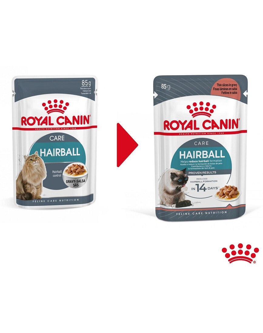 ROYAL CANIN® Hairball Care stukjes in saus is een uitgebalanceerd compleetvoer dat de vorming van haarballen moet verminderen.