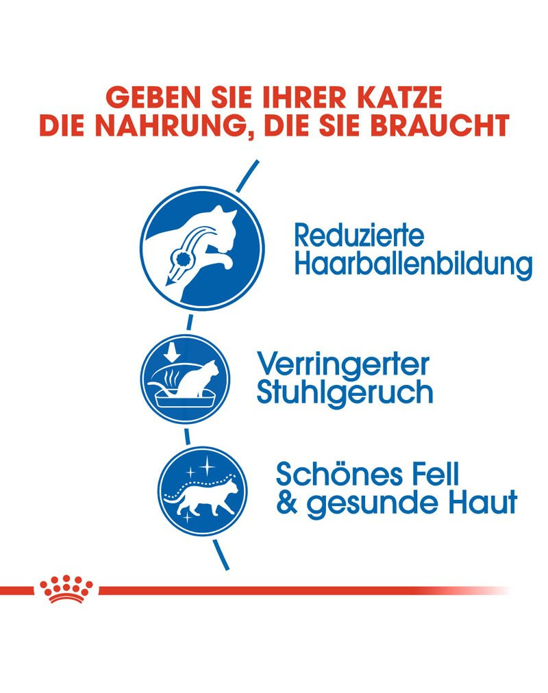 De kattenvoeding ROYAL CANIN Indoor Long Hair is speciaal afgestemd op de bijzondere behoeften van huiskatten met lang haar. Het droogvoer stimuleert op natuurlijke wijze de darmactiviteit en bevordert dankzij geselecteerde vezels (incl. psyllium) een goede spijsvertering. De kat wordt zo ondersteund om haren, die ze tijdens de vachtverzorging heeft ingeslikt, uit te scheiden. Zo wordt de vorming van haarballen voorkomen.