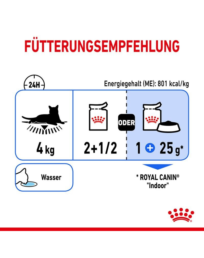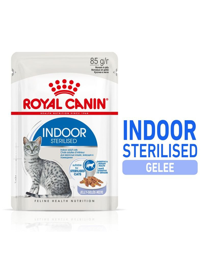 Um den individuellen Vorlieben verschiedener Katze gerecht zu werden, ist ROYAL CANIN INDOOR Sterilised Nassfutter als Stückchen in Soße oder in Gelee erhältlich. Ergänzt wird das Nassfutter für Wohnungskatzen durch ein Sortiment an Trockennahrungen. ROYAL CANIN INDOOR Trockenfutter ist in verschiedenen Variationen erhältlich, je nach Appetit, Felllänge und Alter Ihrer Katze: INDOOR 27, INDOOR APPETITE CONTROL, INDOOR LONG HAIR oder INDOOR 7+.