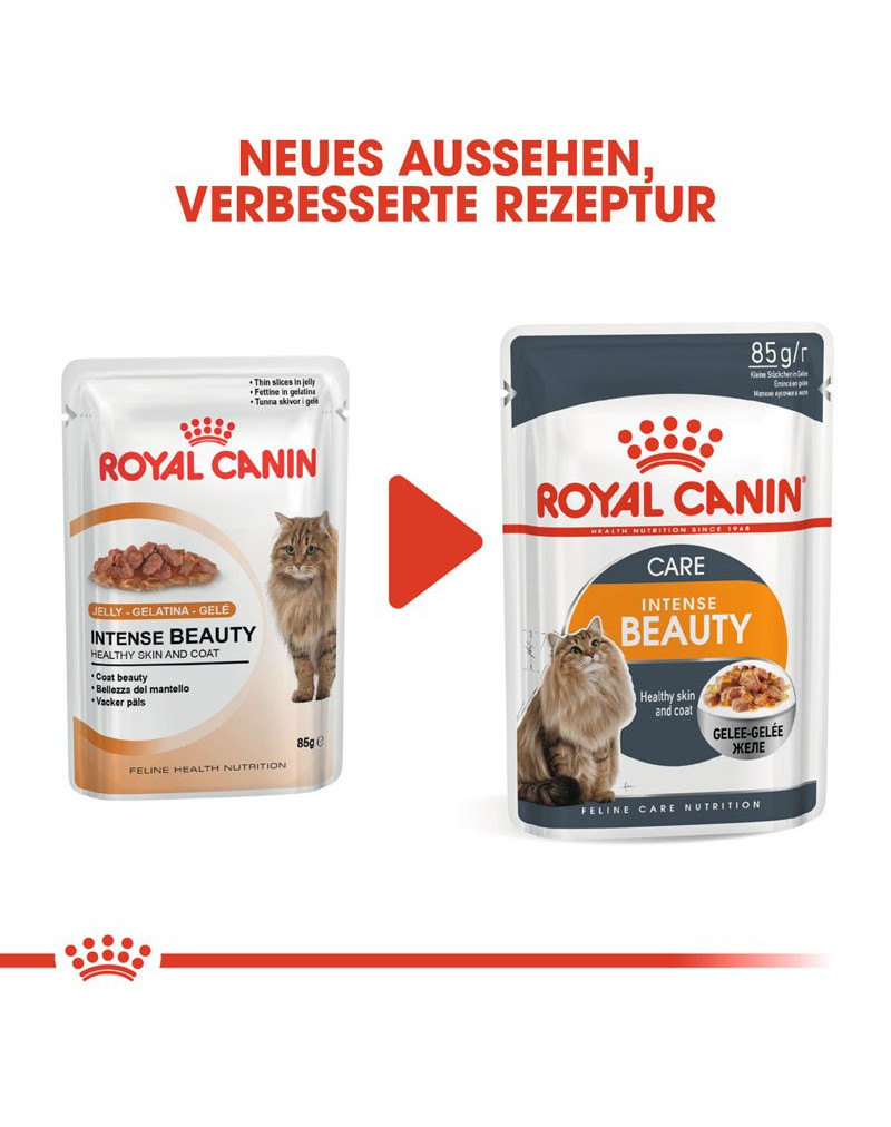 Met ROYAL CANIN Intense Beauty in Gelee zorgt u ervoor dat de gezondheid van huid en vacht, evenals het algemene welzijn van uw kat, te allen tijde optimaal wordt ondersteund.