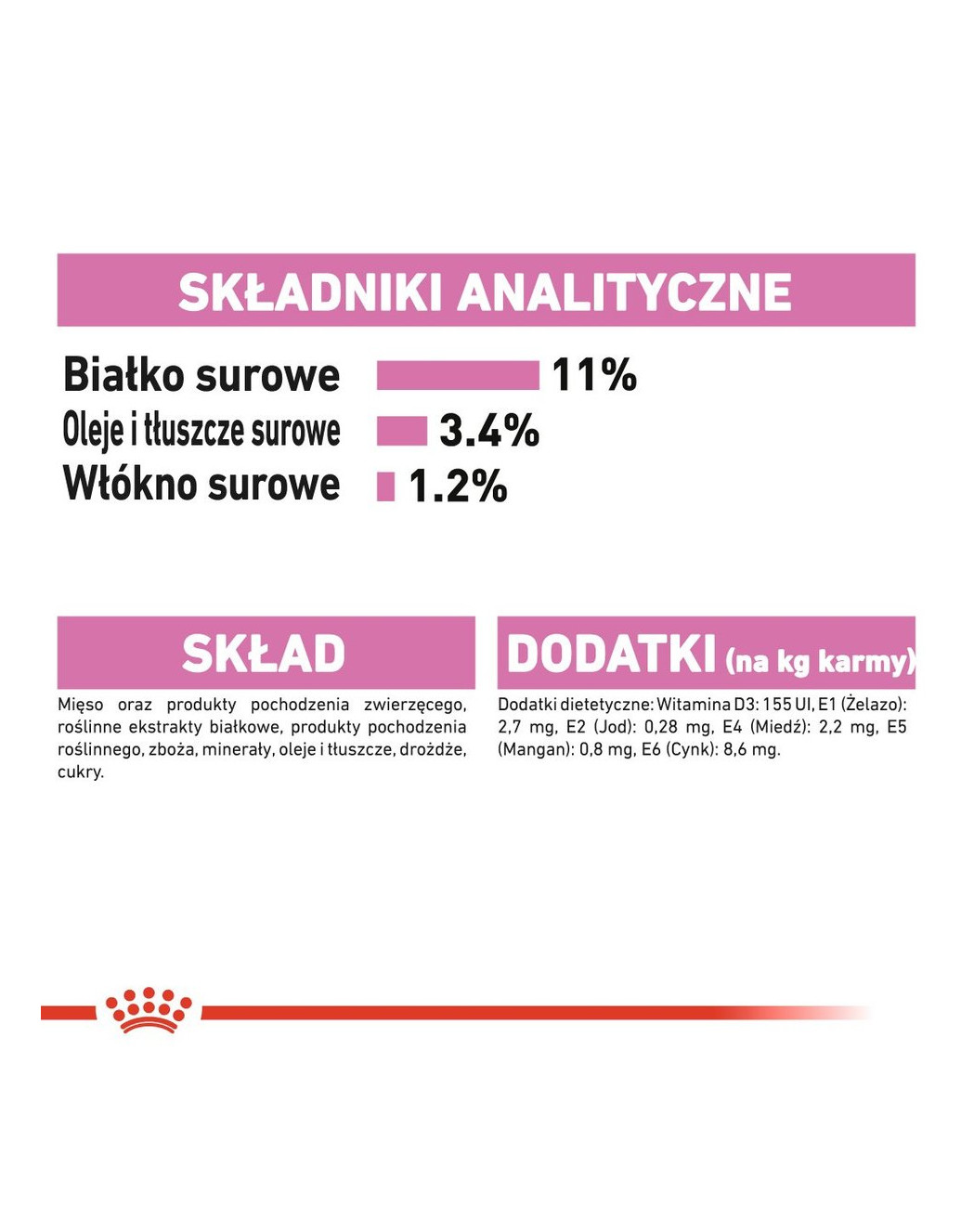 SAMENSTELLING: Vlees en dierlijke bijproducten, plantaardige eiwitextracten, plantaardige bijproducten, granen, mineralen, oliën en vetten, gist, suiker. TOEVOEGINGEN (per kg): Voedingssupplementen: Vitamine D3: 155 IE, E1 (ijzer): 2,7 mg, E2 (jodium): 0,28 mg, E4 (koper): 2,2 mg, E5 (mangaan): 0,8 mg, E6 (zink): 8,6 mg. ANALYTISCHE BESTANDDELEN: Eiwit: 11 % - Vetgehalte: 3,4 % - Ruwe as: 1,5 % - Ruwe vezels: 1,2 % - Vocht: 80,5 %. GEBRUIKSAANWIJZING: zie tabel. Toelatingsnummer en partijreferentienummer, ten minste houdbaar tot: zie opdruk. Bewaren op een koele en droge plaats.