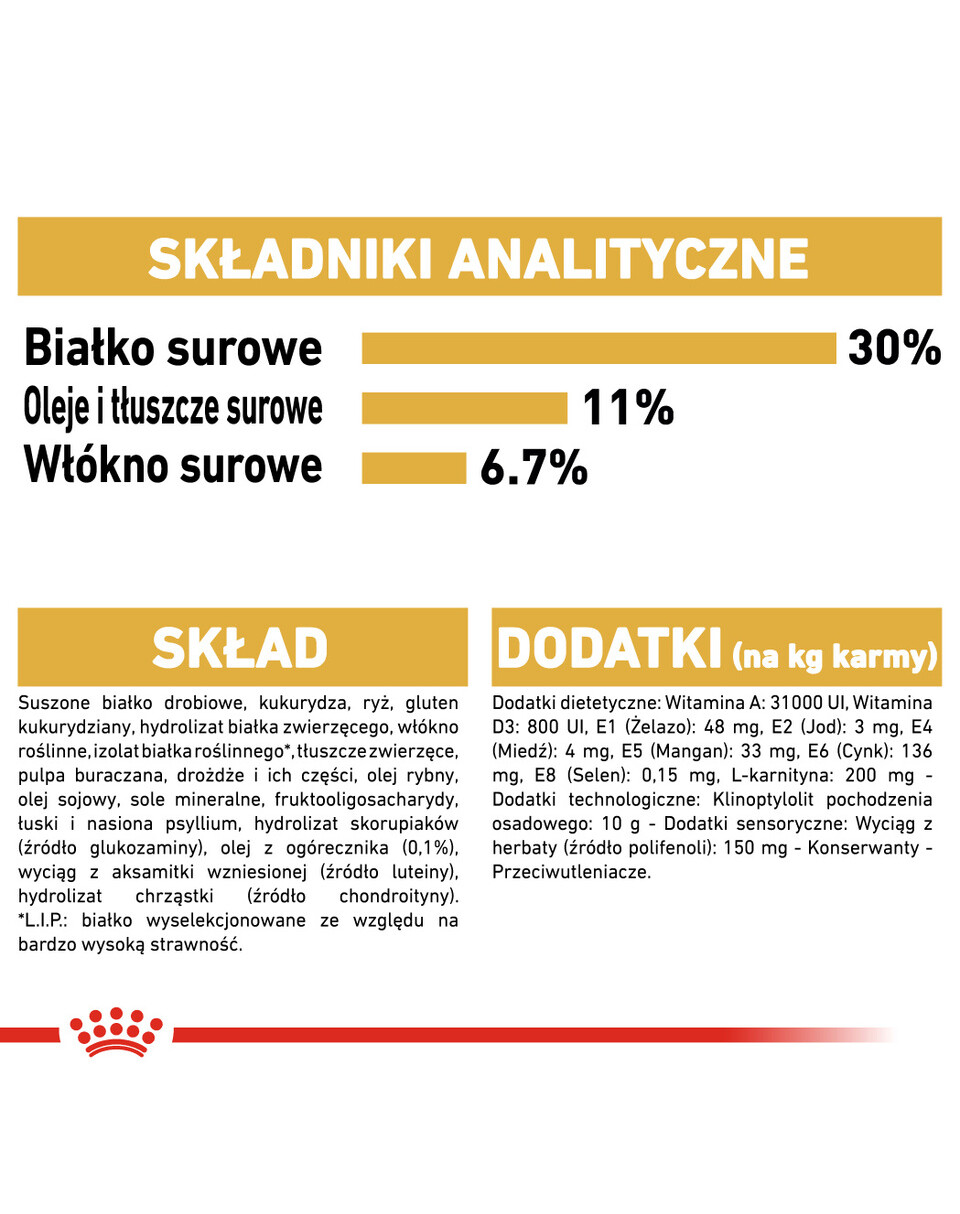 Arachidonzuur (%) 0,07, mineralen (%) 6,6, ruwe vezel (%) 6,6, vezels (%) 14,1, EPA+DHA (%) 0,41, vetten (%) 11, linolzuur (%) 2,31, metabolische energie (kcal/kg) 3255,5, vochtgehalte (%) 9,5, niet-stikstofhoudende extracteerbare bestanddelen (NFE) (%) 36,3, omega-3-vetzuren (%) 0,69, omega-6-vetzuren (%) 2,51, eiwit (%) 30, zetmeel (%) 28,8, arginine (%) 1,67, DL-methionine (%) 0,56, glucosaminechloride (mg/kg) 1215, groene thee- en druivenpolyfenolen (mg/kg) 150, L-Carnitine (mg/kg) 200, L-lysine (%) 1,19, luteïne (mg/kg) 5, methionine-cystine (%) 1,01, taurine (mg/kg) 3500, biotine (mg/kg) 2,9, choline (mg/kg) 2000, foliumzuur (mg/kg) 12,9, Vitamine A (IE/kg) 33000, Vitamine B1 (thiamine) (mg/kg) 25,6, Vitamine B12 (cobalamine) (mg/kg) 0,13, Vitamine B2 (riboflavine) (mg/kg) 46,2, Vitamine B3 (niacine) (mg/kg) 500, Vitamine B5 (pantotheenzuur) (mg/kg) 137,6, Vitamine B6 (pyridoxine) (mg/kg) 71,8, Vitamine C (mg/kg) 300, Vitamine D3 (IE/kg) 800, Vitamine E (mg/kg) 600, chloor (%) 0,69, koper (mg/kg) 10, jodium (mg/kg) 3,3, ijzer (mg/kg) 210, magnesium (%) 0,08, mangaan (mg/kg) 63, kalium (%) 0,7, selenium (mg/kg) 0,32, natrium (%) 0,4, zink (mg/kg) 230