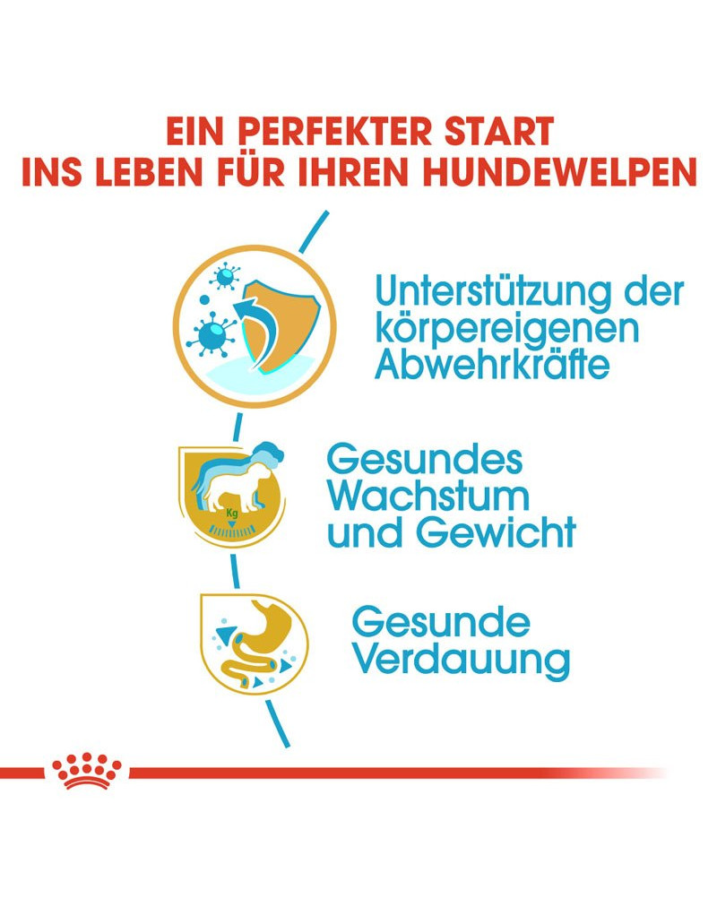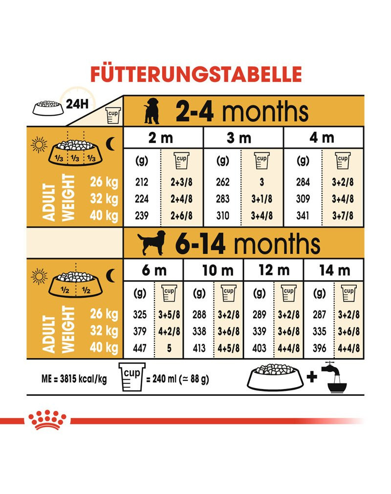 Der Labrador ist in der Regel ein fröhlicher und kinderfreundlicher Familienhund. ROYAL CANIN Labrador Retriever Puppy wurde speziell für Labrador Welpen bis zu 15 Monaten entwickelt. Dank eines exklusiven Antioxidanzienkomplexes (einschließlich Vitamin E) hilft das Welpenfutter dabei, die körpereignen Abwehrkräfte zu unterstützen, während sie sich allmählich entwickeln. Weiterhin enthält ROYAL CANIN Labrador Retriever Puppy eine spezielle Kombination von Nährstoffen mit hochwertigem Protein (L.I.P.), das speziell für seine hohe Verdaulichkeit ausgewählt wurde. Zusätzlich helfen die in der Rezeptur enthaltenen Nährstoffe dabei, ein gesundes Gleichgewicht der Darmflora aufrechtzuerhalten, was wiederum zu einer guten Stuhlqualität beiträgt.