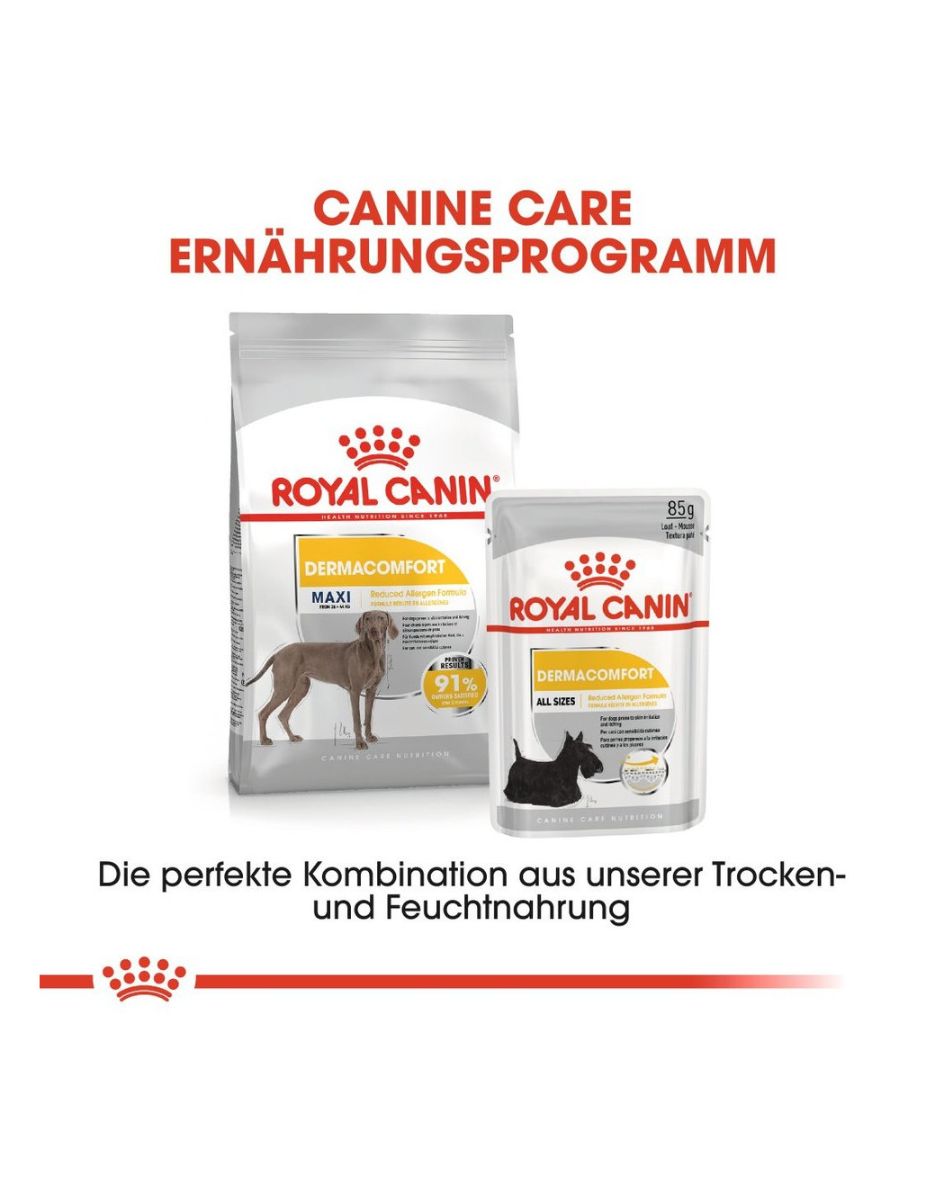 Het Dermacomfort-voedingsprogramma is verkrijgbaar in twee varianten: als krokant droogvoer en als smakelijk natvoer in een vers zakje. Beide varianten zijn geschikt als volledige voeding, maar kunnen ook perfect met elkaar worden gecombineerd. U kunt natvoer en droogvoer in elke gewenste verhouding serveren.