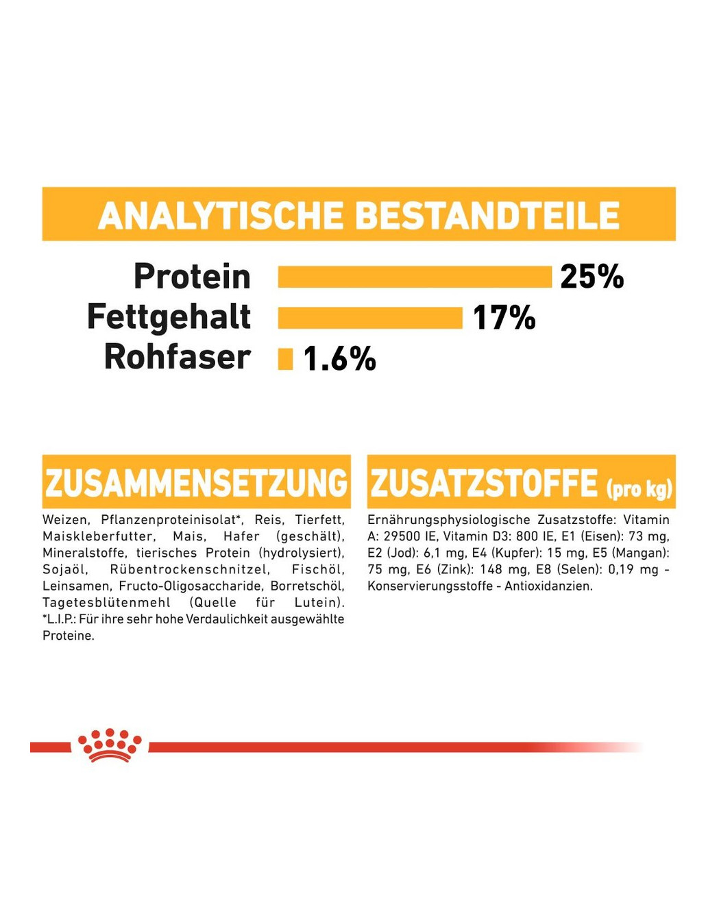 Unterstützung der Gesundheit der empfindlichen Haut durch Reduzierung der Eiweißanzahl, die als potentiale Quelle der Allergene betrachtet werden. Im Rahmen der Zusammensetzung wurden die gewählten verdaulichen Substanzen verwendet, was übermäßiges Kratzen der Hunde verhindert.