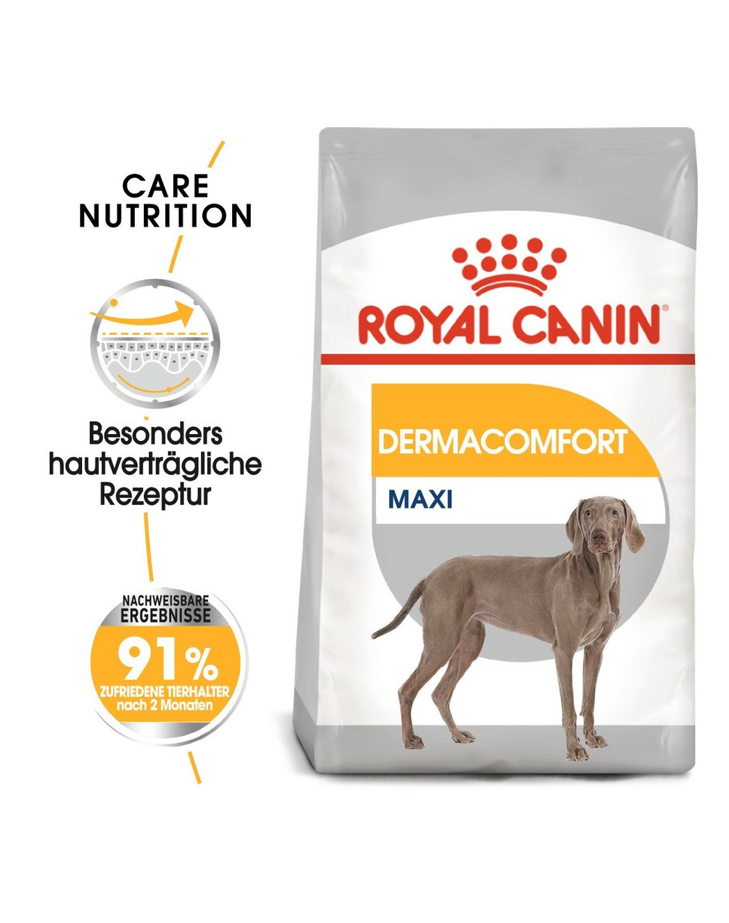 ROYAL CANIN Dermacomfort Maxi is ontwikkeld met actieve voedingsstoffen die bijdragen aan de gezondheid van de huid van uw hond. Het bevat Omega 3- en 6-vetzuren om de huid te kalmeren. Hierdoor wordt de huid minder gevoelig voor irriterende stoffen waarmee uw hond in contact kan komen.