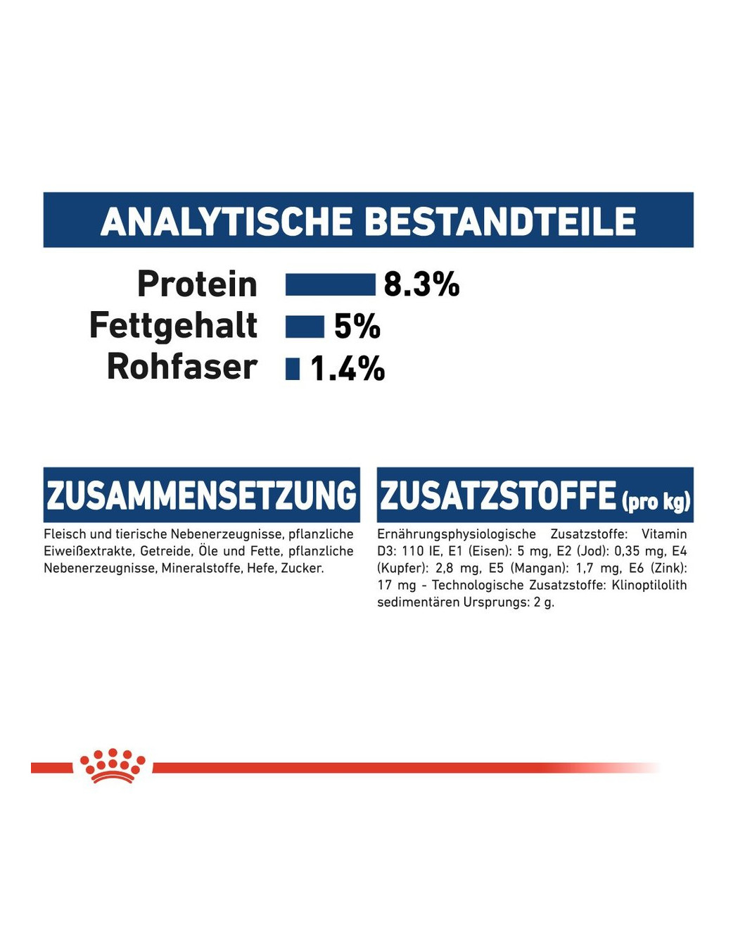 ANALYTISCHE BESTANDDELEN: Ruw eiwit: 30,0 % – Ruwe oliën en vetten: 16,0 % – Ruw as: 7,9 % – Ruwe vezels: 2,8 % – Omega-3-vetzuren (DHA): 0,16 % – Vitamine E: 495 mg/kg – Vitamine C: 395 mg/kg. Metaboliseerbare energie: 3779 kcal/kg.