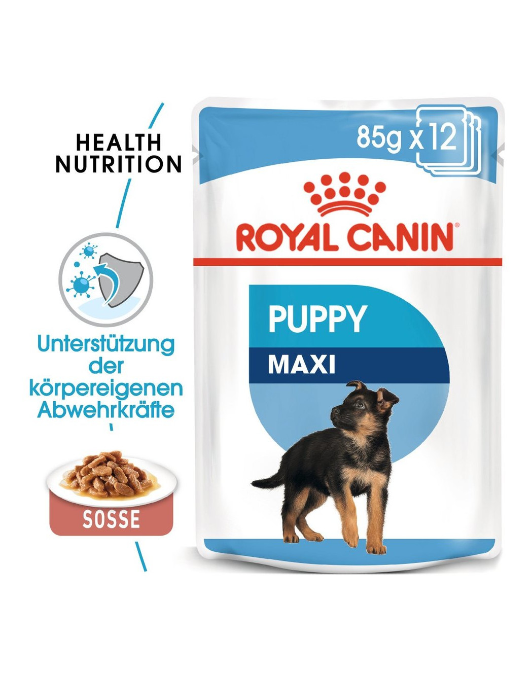 ROYAL CANIN Maxi Puppy in saus is geschikt voor pups met een eindgewicht tussen 26 en 44 kg tot de 15e maand en is speciaal afgestemd op de behoeften van grote pups. ROYAL CANIN Maxi Puppy in saus bevat een exclusief complex van antioxidanten (inclusief vitamine E), dat de natuurlijke afweer van de pup in de groeifase ondersteunt.