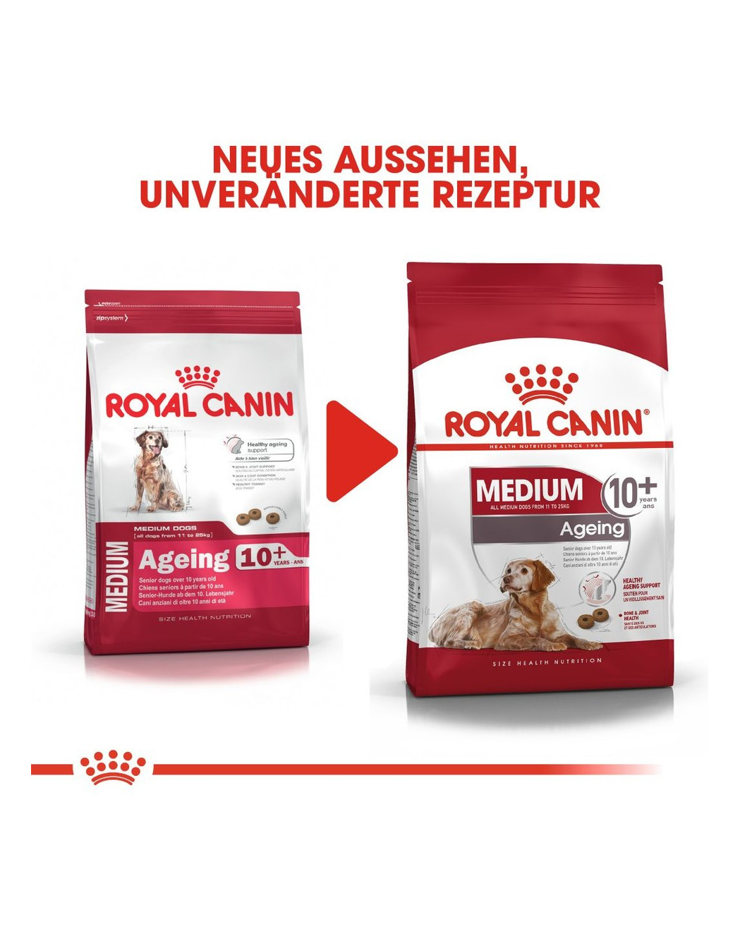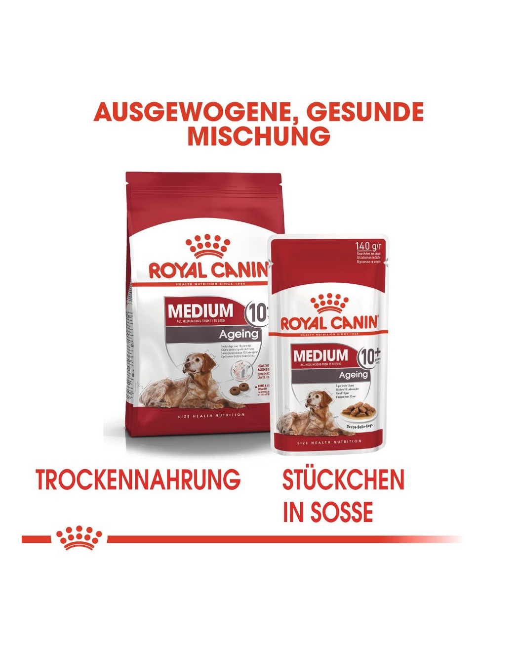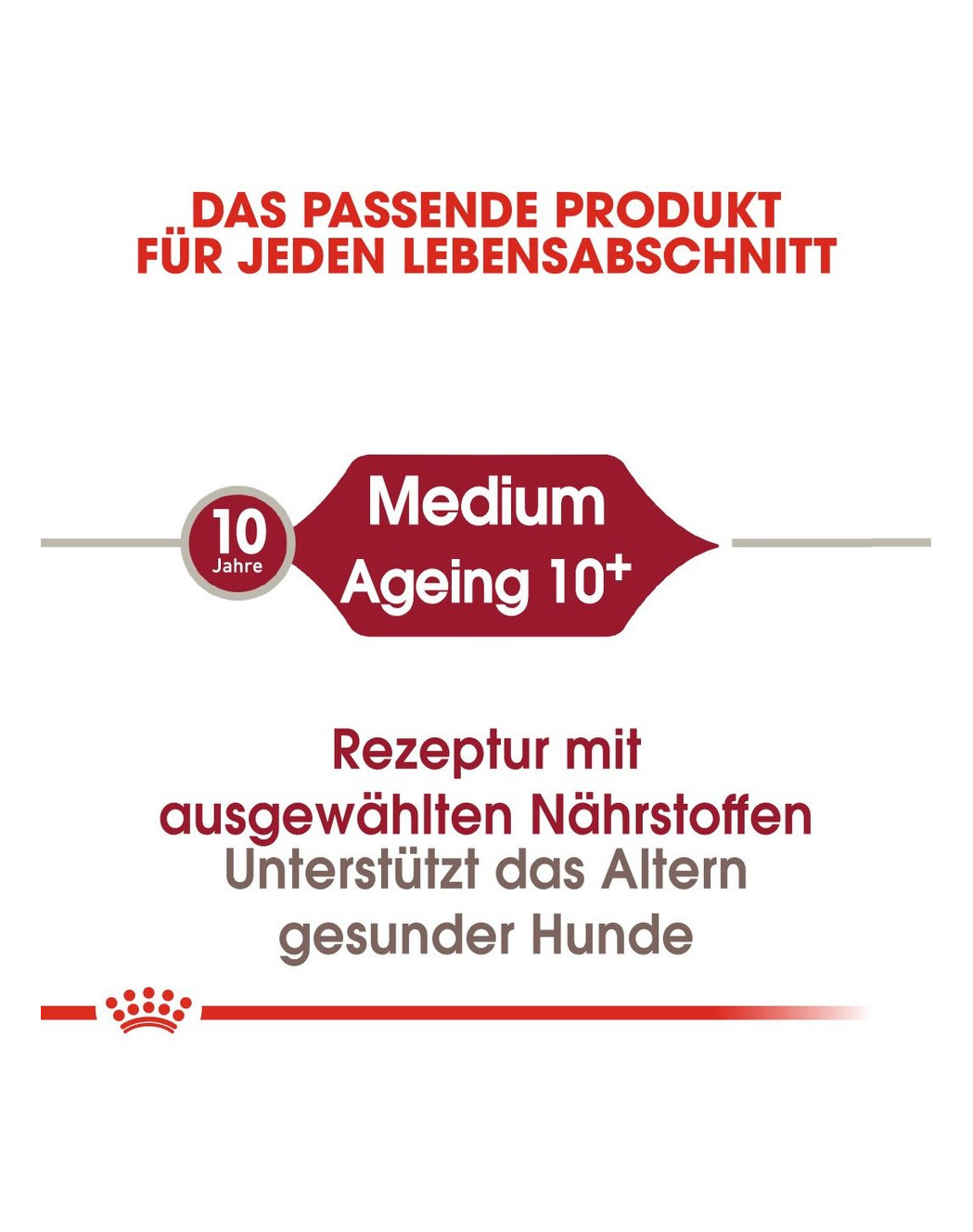 Für Hunde mittelgroßer Rassen, die älter als 10 Jahre sind, wird ROYAL CANIN Medium Adult 10+ empfohlen. Es handelt sich um ein Alleinfuttermittel mit einer ausgewogenen Nährstoffzusammensetzung, das speziell auf die besonderen Bedürfnisse älterer Hunde abgestimmt ist.
