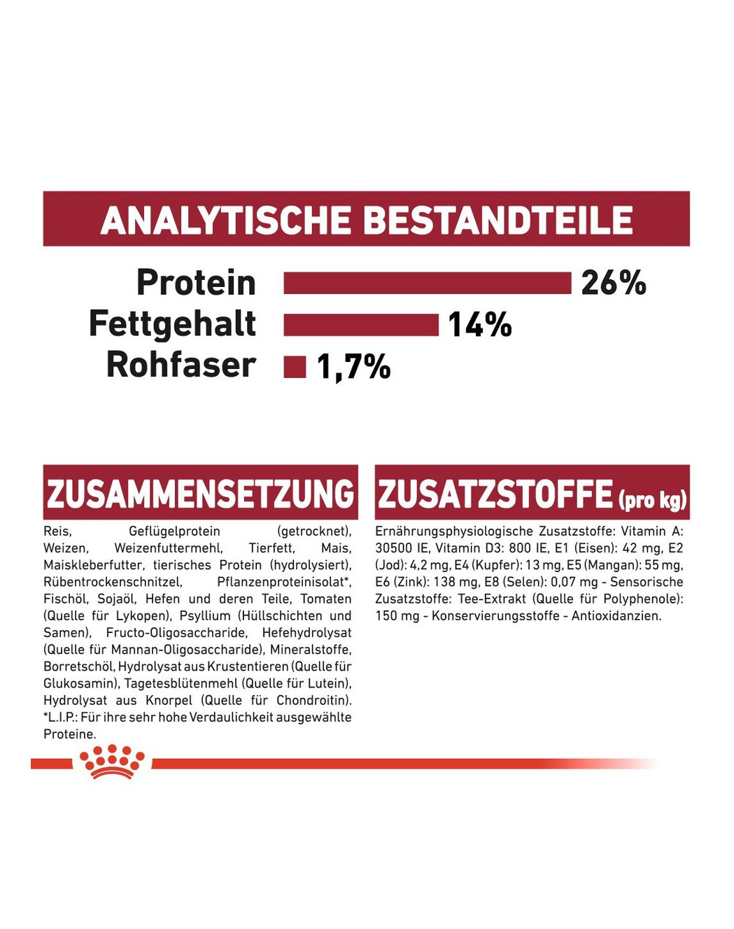 ZUTATEN: Getrocknetes Geflügelprotein, Weizenmehl, Mais, Maismehl, Reis, tierische Fette, Maiskleber, Weizen, Rübenschnitzel, hydrolisiertes tierisches Eiweiß, Weizenkleber, Fischöl, Sojaöl, Hefeprodukte, Mineralstoffe, Flohsamenschalen und -samen, Fructo-Oligosaccharide, Algenöl aus Schizochytrium sp. (Quelle für EPA- und DHA-Säuren), Hefe (Quelle für Manno-Oligosaccharide), durch Fermentation gewonnenes Glucosamin, Samtmehl, hydrolysierter Knorpel (Quelle für Chondroitin).