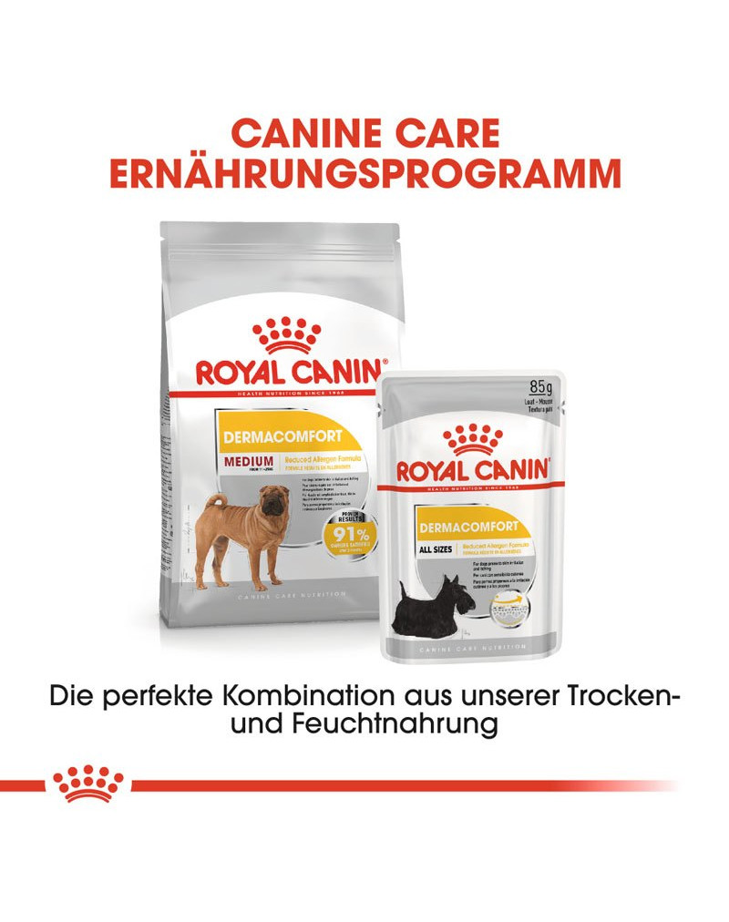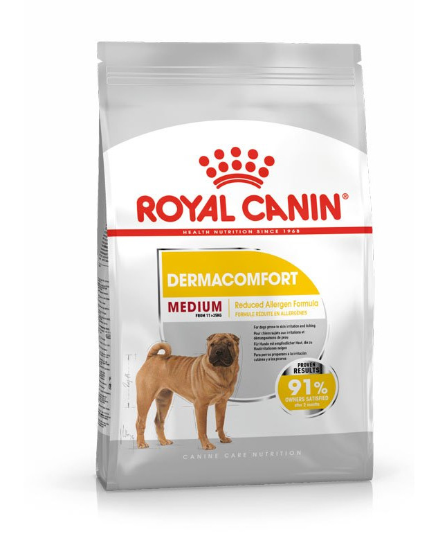 ROYAL CANIN Dermacomfort Medium is geschikt voor honden tussen 11 en 25 kg en bevat zorgvuldig ontwikkelde brokjes die perfect zijn afgestemd op het gebit van uw middelgrote hond.