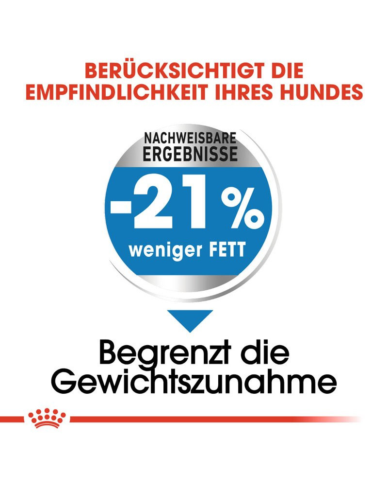 ROYAL CANIN LIGHT WEIGHT CARE Medium bevat 21% minder vet dan conventioneel voer voor volwassen honden, zoals in interne studies van ROYAL CANIN is aangetoond.