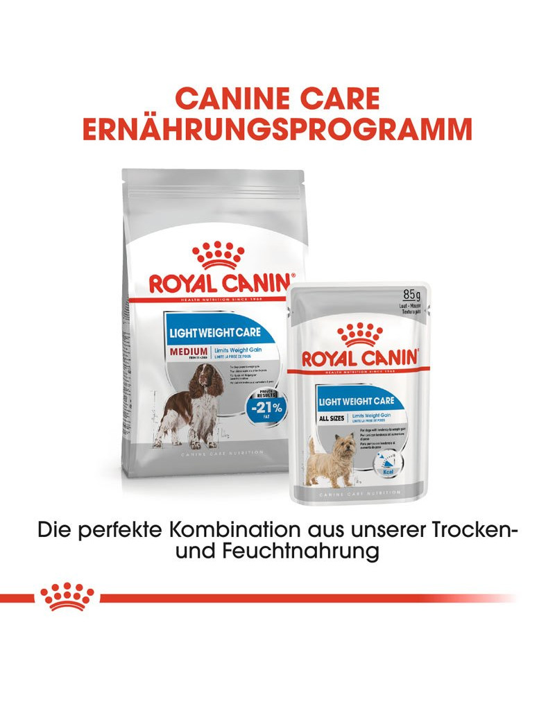LIGHT WEIGHT CARE Medium is in twee varianten verkrijgbaar: als knapperig droogvoer en als smakelijk natvoer in een vers zakje. Beide varianten zijn als volledige voeding geschikt en kunnen perfect met elkaar worden gecombineerd. U kunt bijvoorbeeld het natvoer als smakelijke aanvulling op het droogvoer aanbieden.