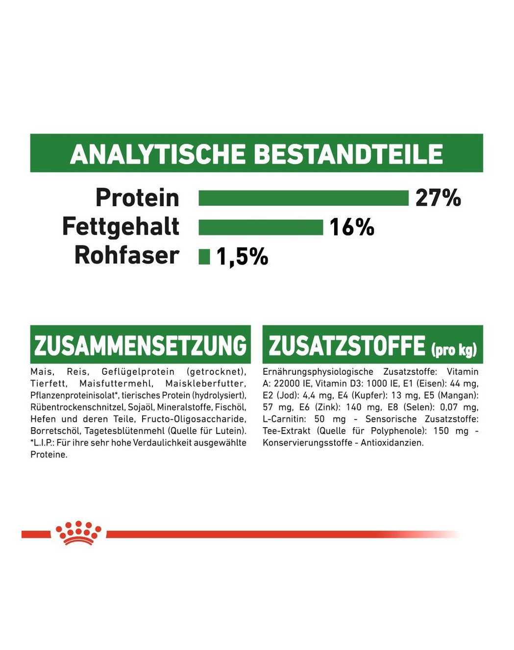ANALYTISCHE BESTANDDELEN: Ruw eiwit: 27,0% - Ruwe vezels: 1,5% - Ruwe oliën en -vetten: 16,0% - Ruwe as: 6,3% - Metaboliseerbare energie: 3923 kcal/kg.